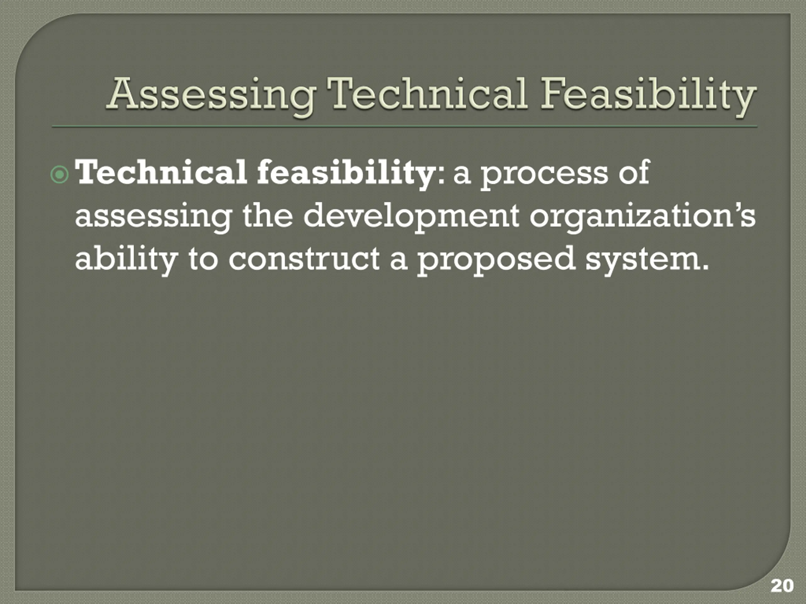 Technical feasibility: a process of assessing the development organization s ability to construct a proposed system. 20