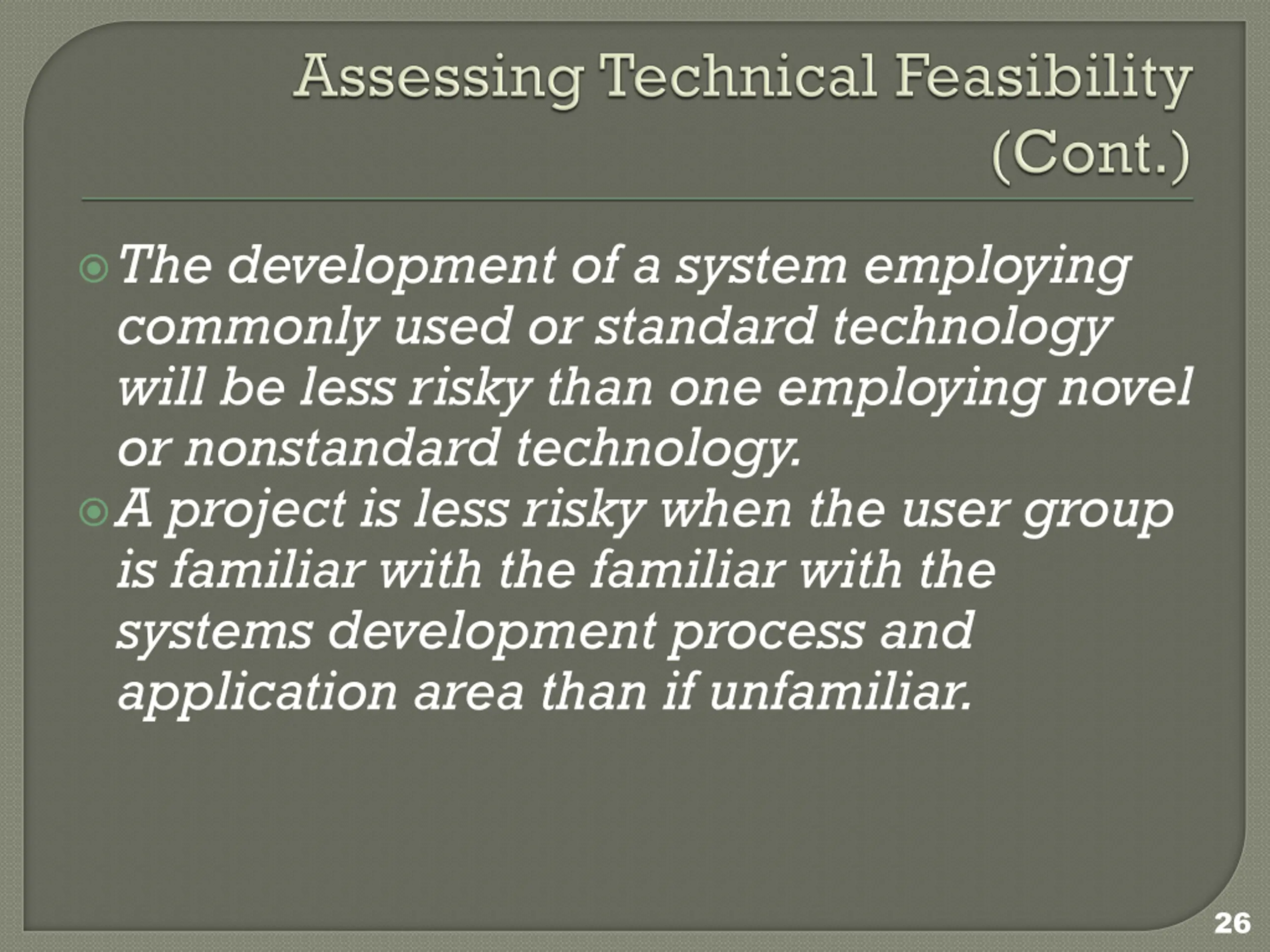 The development of a system employing commonly used or standard technology will be less risky than one employing novel or nonstandard technology. A project is less risky when the user group is familiar with the familiar with the systems development process and application area than if unfamiliar. 26