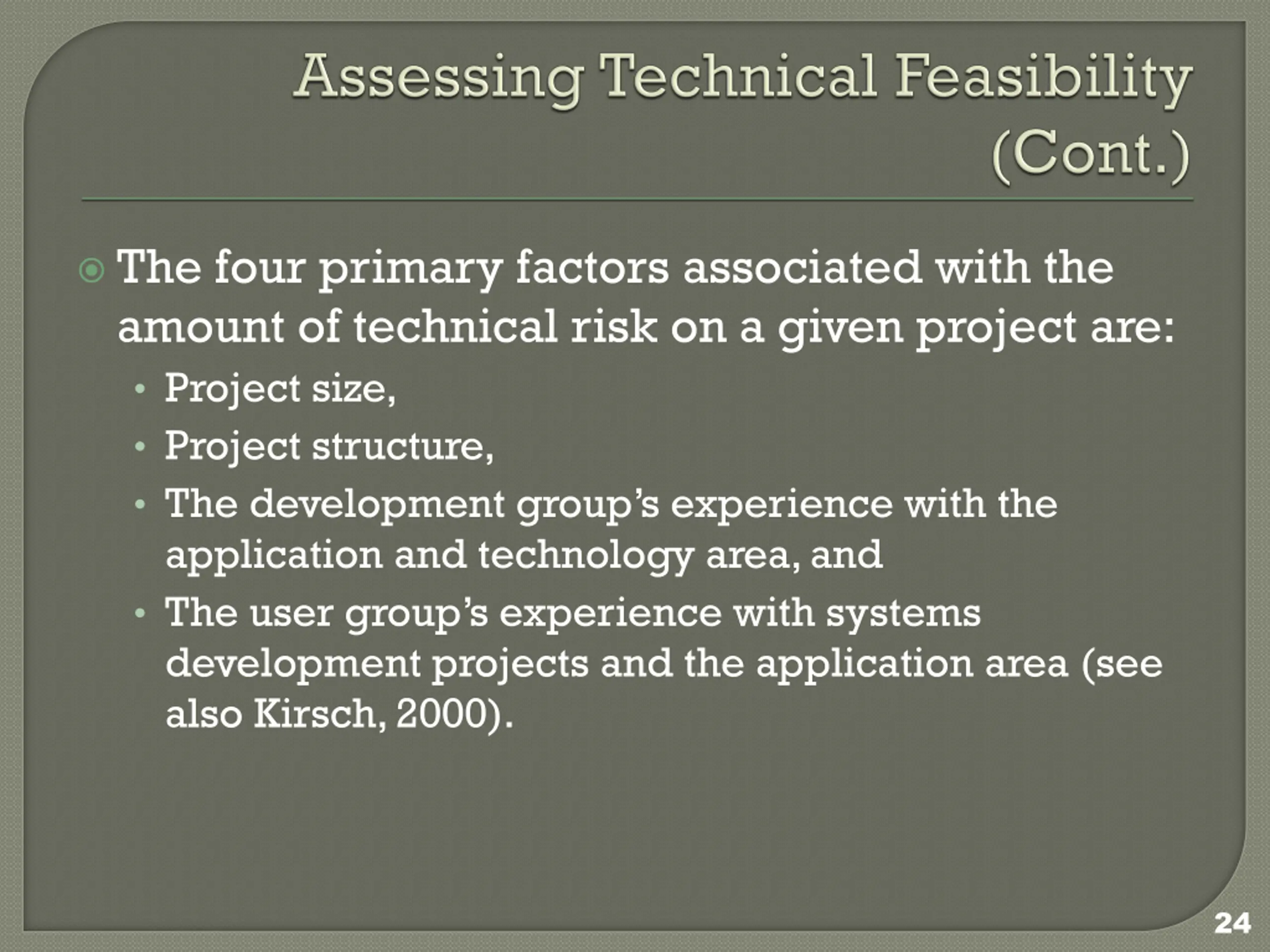The four primary factors associated with the amount of technical risk on a given project are: Project size, Project structure, The development group s experience with the application and technology area, and The user group s experience with systems development projects and the application area (see also Kirsch, 2000). 24