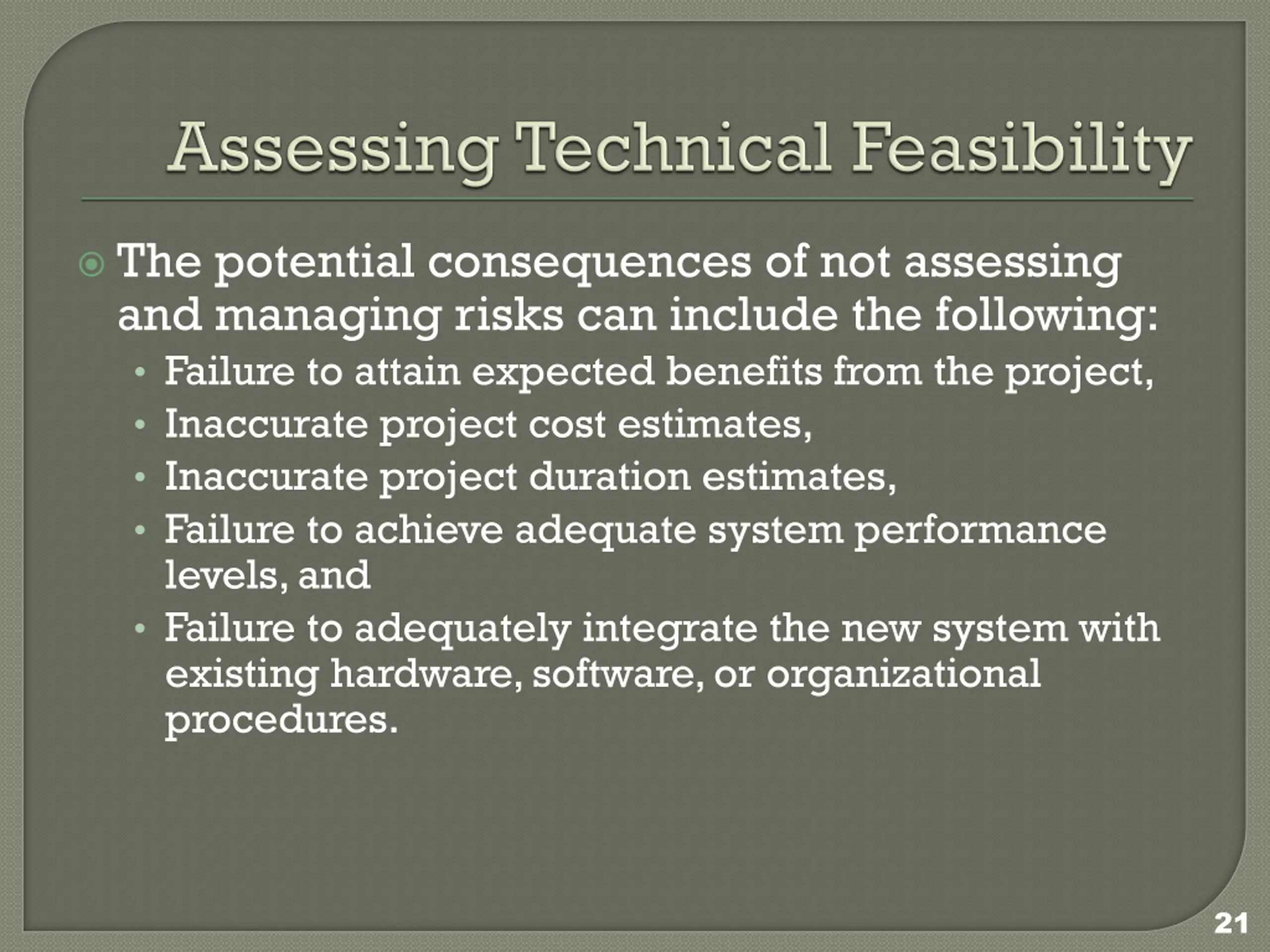 The potential consequences of not assessing and managing risks can include the following: Failure to attain expected benefits from the project, Inaccurate project cost estimates, Inaccurate project duration estimates, Failure to achieve adequate system performance levels, and Failure to adequately integrate the new system with existing hardware, software, or organizational procedures. 21