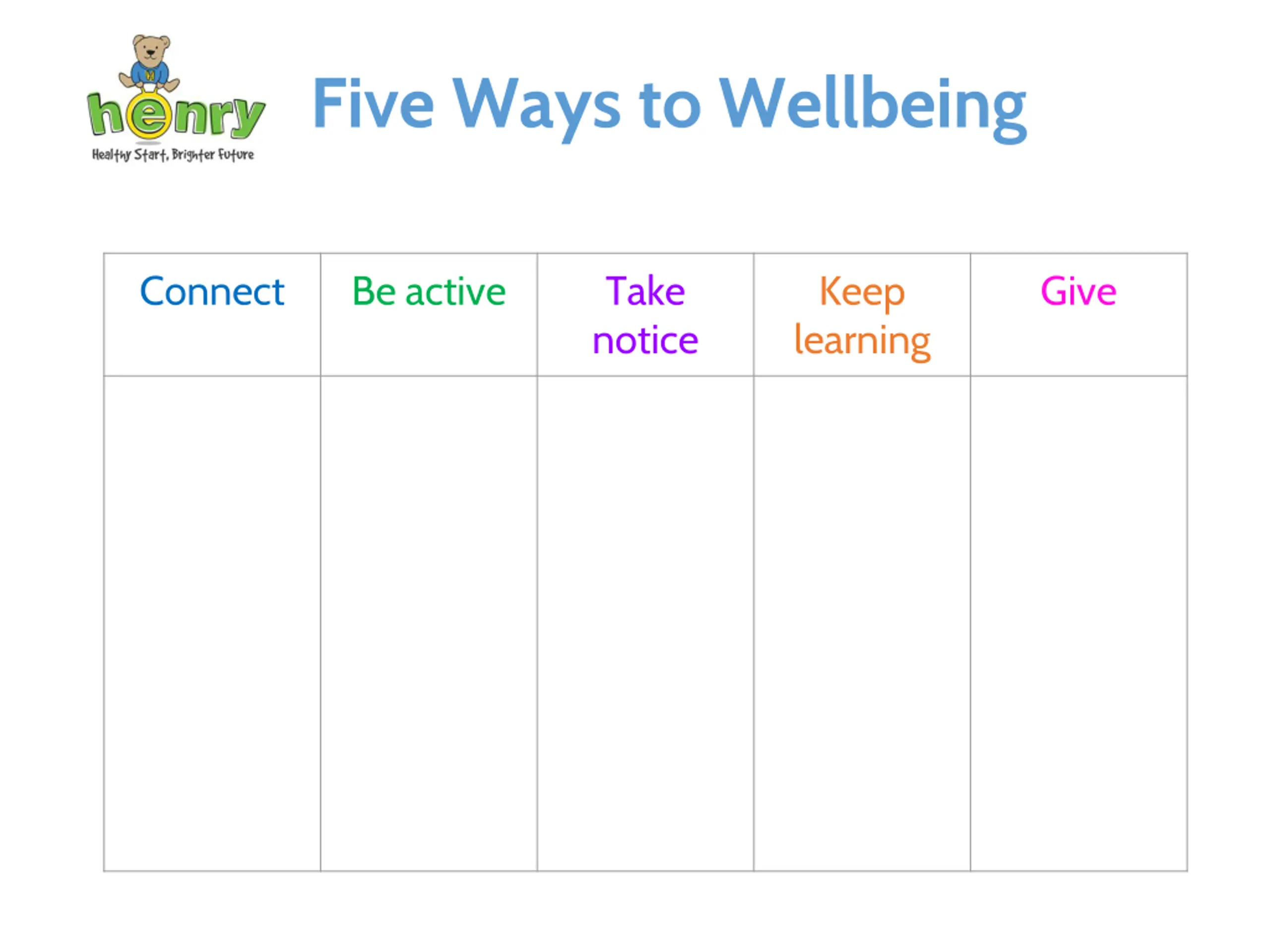 Five Ways to Wellbeing Connect Be active Take notice Keep learning Give