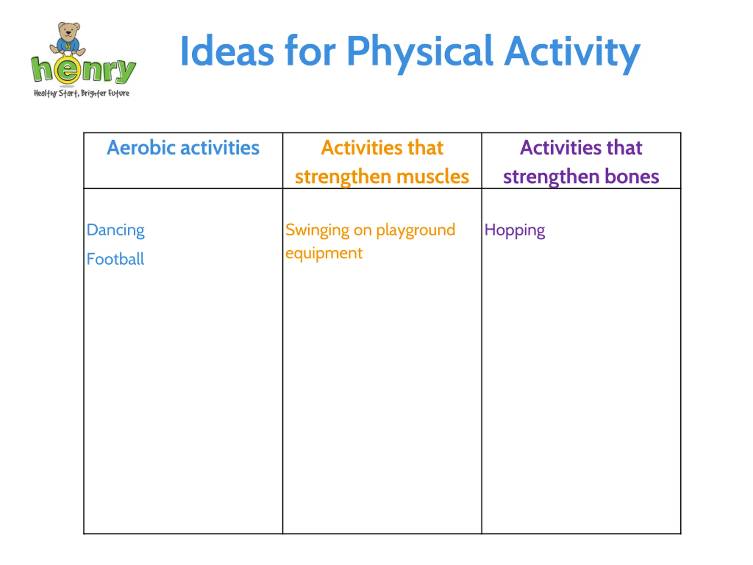 Ideas for Physical Activity Aerobic activities Activities that strengthen muscles Activities that strengthen bones Dancing Swinging on playground equipment Hopping Football