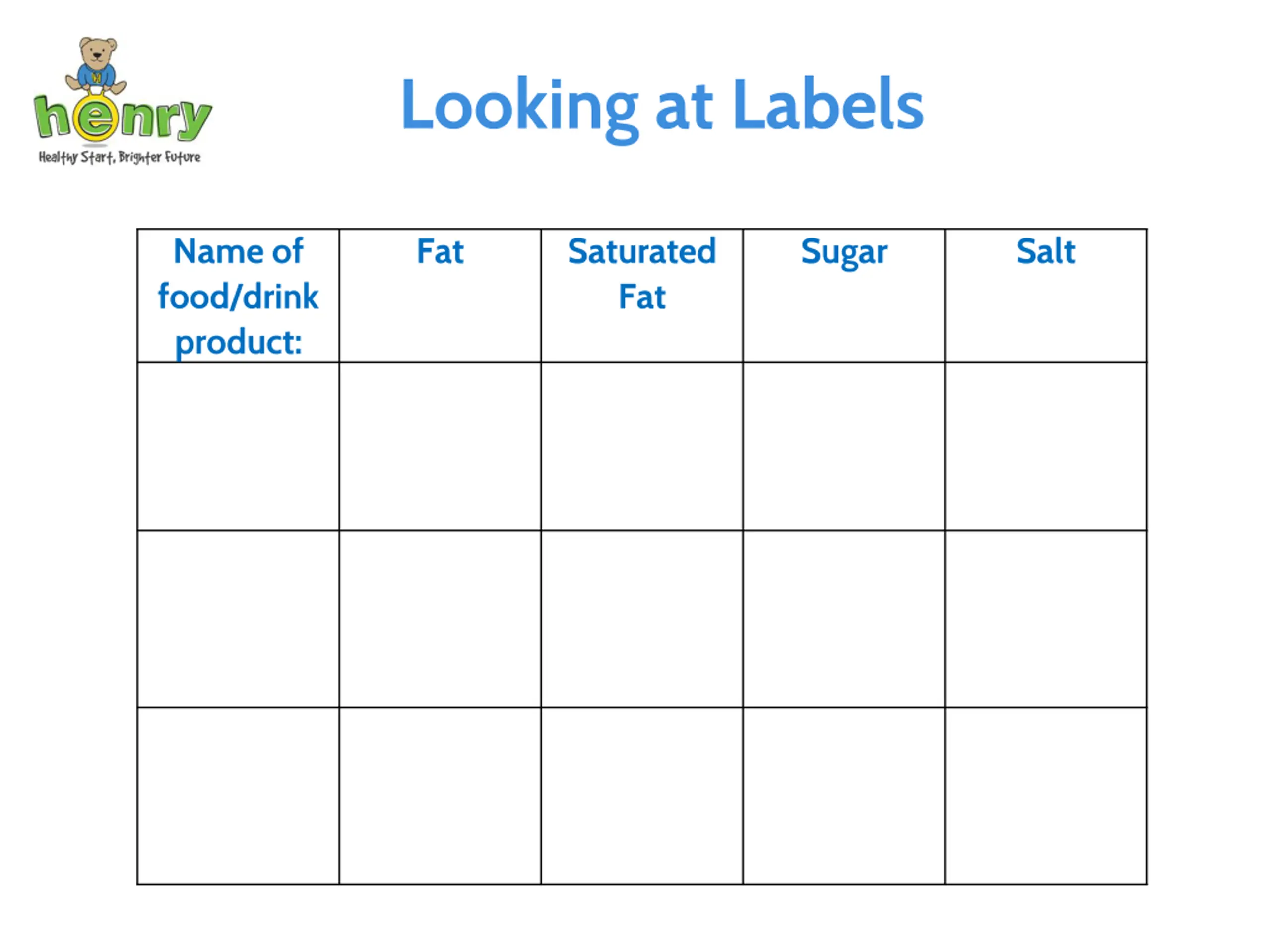 Looking at Labels Name of food/drink product: Fat Saturated Fat Sugar Salt