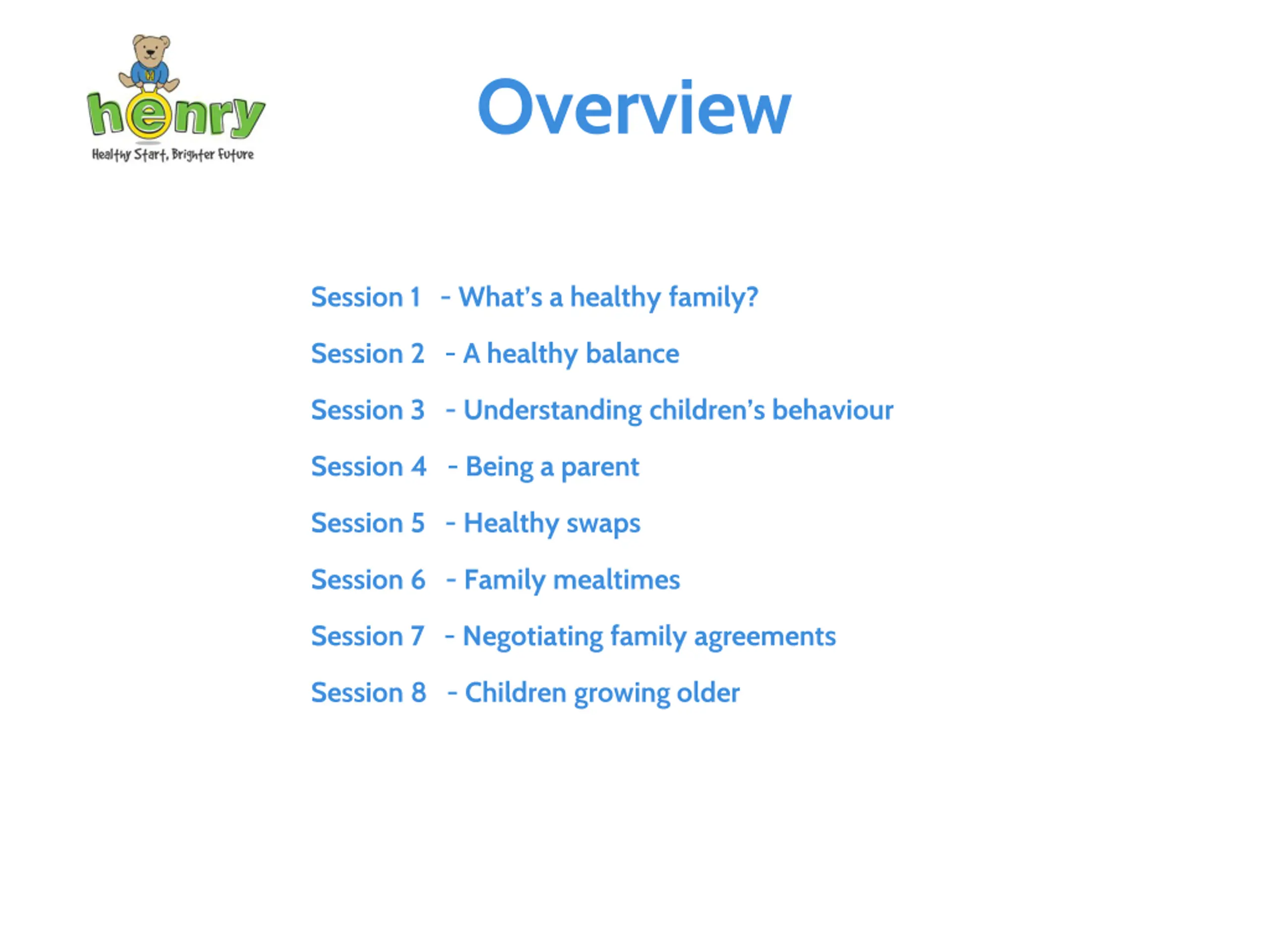 Overview Session 1 - What s a healthy family? Session 2 - A healthy balance Session 3 - Understanding children s behaviour Session 4 - Being a parent Session 5 - Healthy swaps Session 6 - Family mealtimes Session 7 - Negotiating family agreements Session 8 - Children growing older