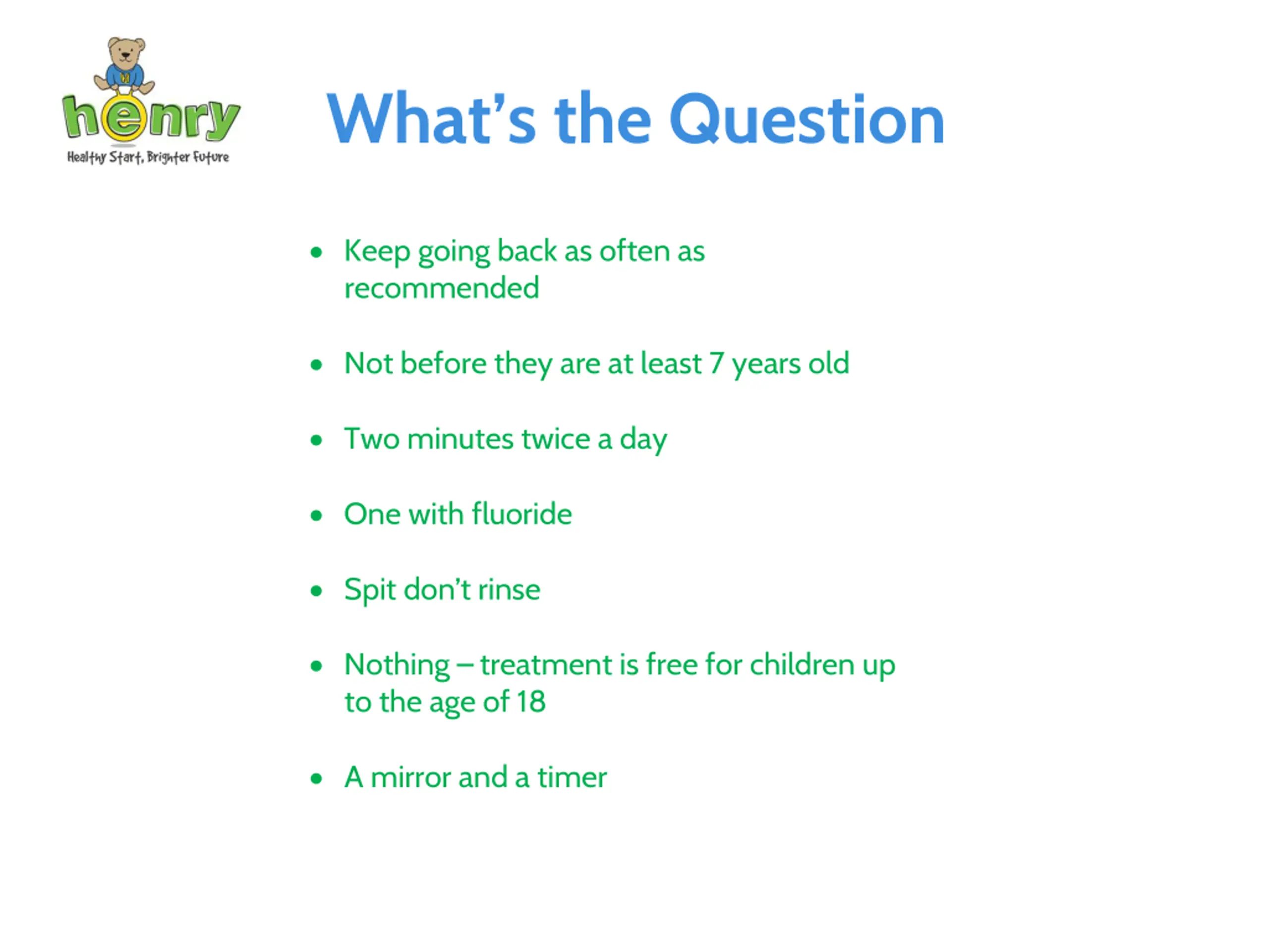 Whats the Question Keep going back as often as recommended Not before they are at least 7 years old Two minutes twice a day One with fluoride Spit don t rinse Nothing treatment is free for children up to the age of 18 A mirror and a timer
