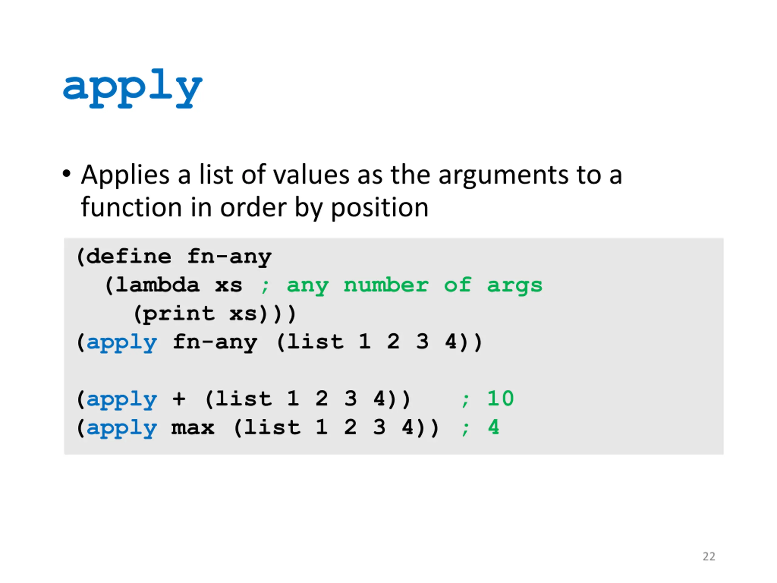 apply Applies a list of values as the arguments to a function in order by position (define fn-any (lambda xs ; any number of args (print xs))) (apply fn-any (list 1 2 3 4)) (apply + (list 1 2 3 4)) ; 10 (apply max (list 1 2 3 4)) ; 4 22