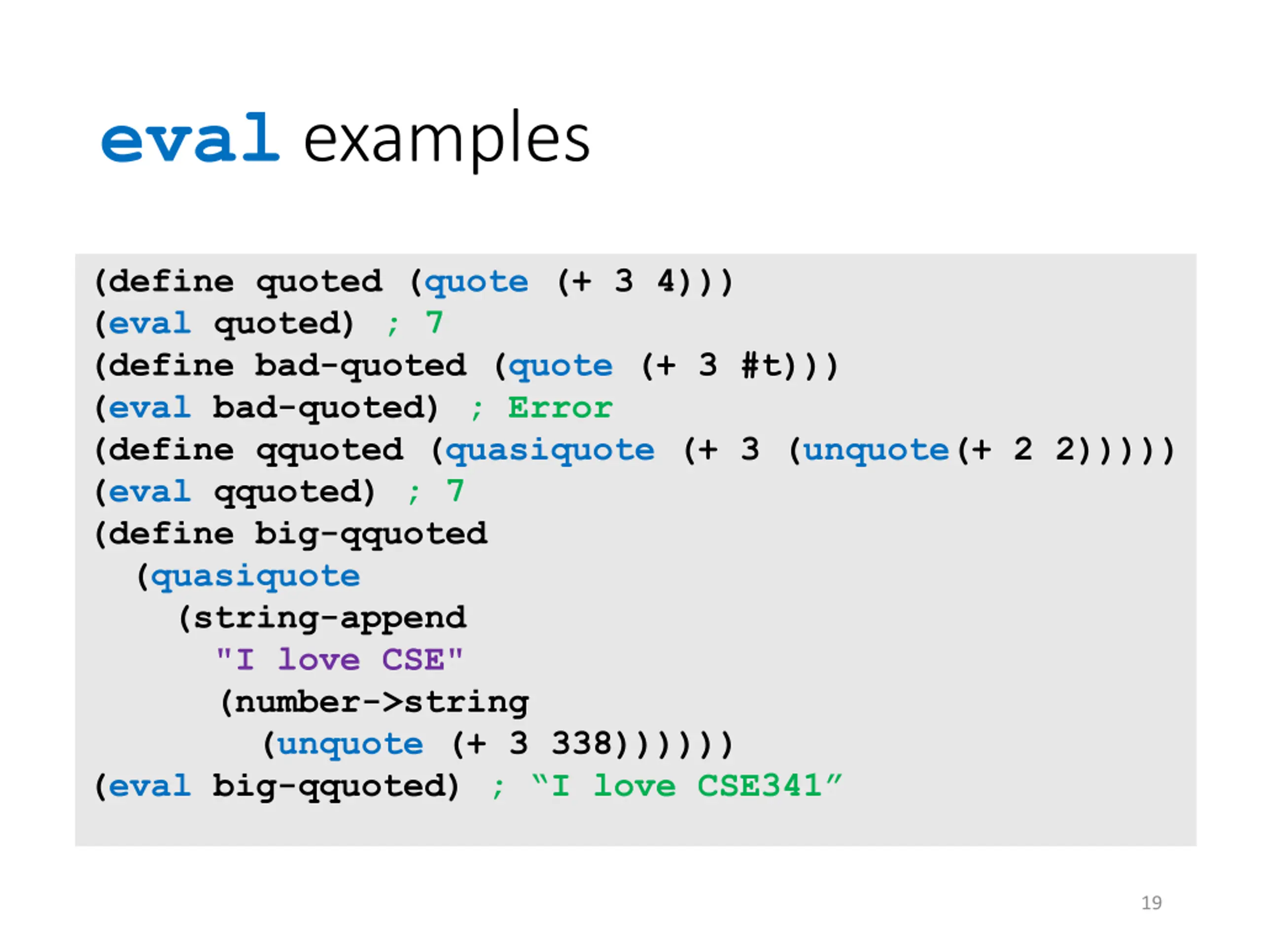 eval examples (define quoted (quote (+ 3 4))) (eval quoted) ; 7 (define bad-quoted (quote (+ 3 #t))) (eval bad-quoted) ; Error (define qquoted (quasiquote (+ 3 (unquote(+ 2 2))))) (eval qquoted) ; 7 (define big-qquoted (quasiquote (string-append "I love CSE" (number->string (unquote (+ 3 338)))))) (eval big-qquoted) ; I love CSE341 19