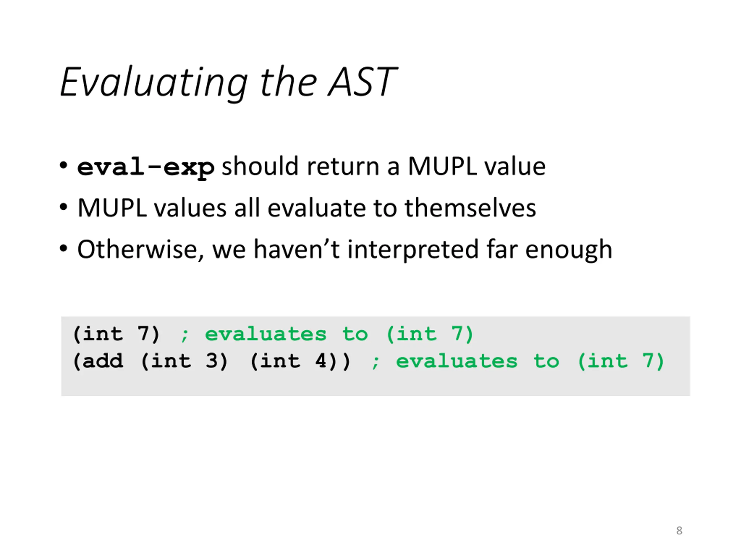 Evaluating the AST eval-exp should return a MUPL value MUPL values all evaluate to themselves Otherwise, we haven t interpreted far enough (int 7) ; evaluates to (int 7) (add (int 3) (int 4)) ; evaluates to (int 7) 8