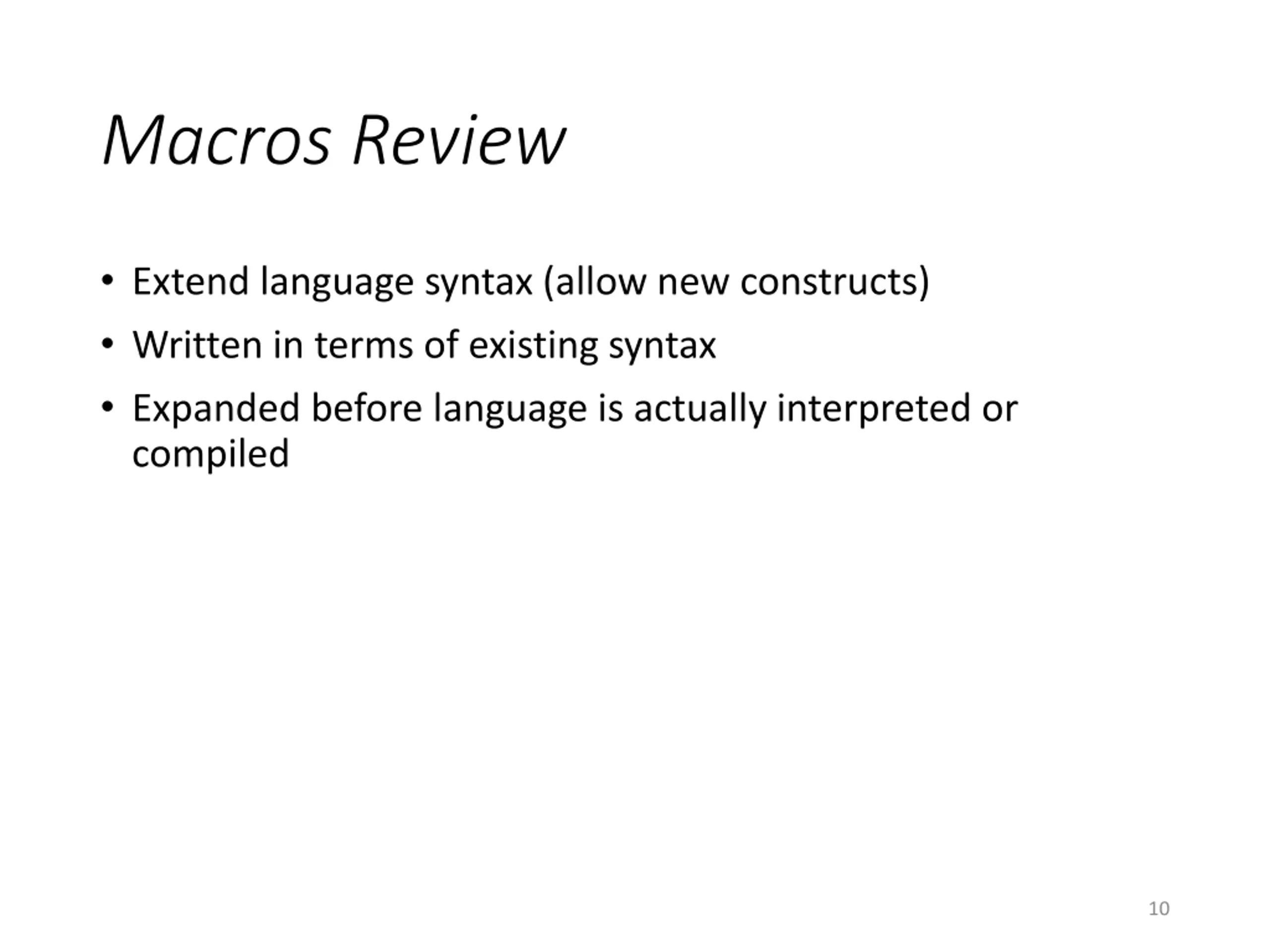 Macros Review Extend language syntax (allow new constructs) Written in terms of existing syntax Expanded before language is actually interpreted or compiled 10