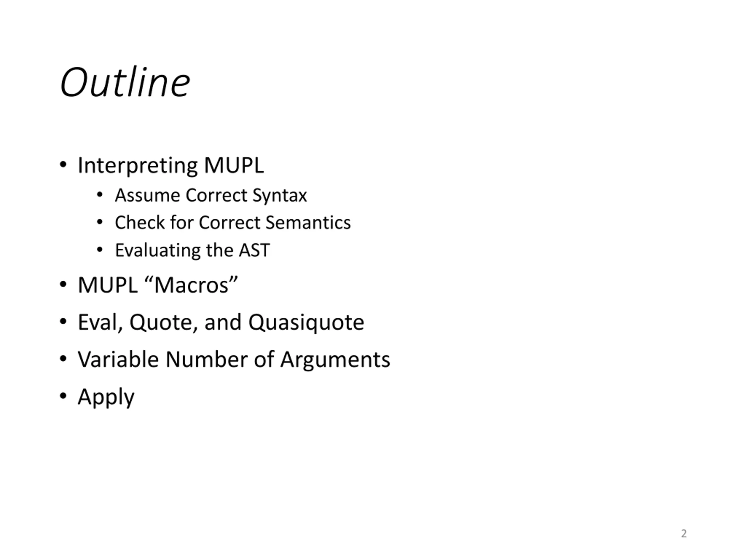 Outline Interpreting MUPL Assume Correct Syntax Check for Correct Semantics Evaluating the AST MUPL Macros Eval, Quote, and Quasiquote Variable Number of Arguments Apply 2