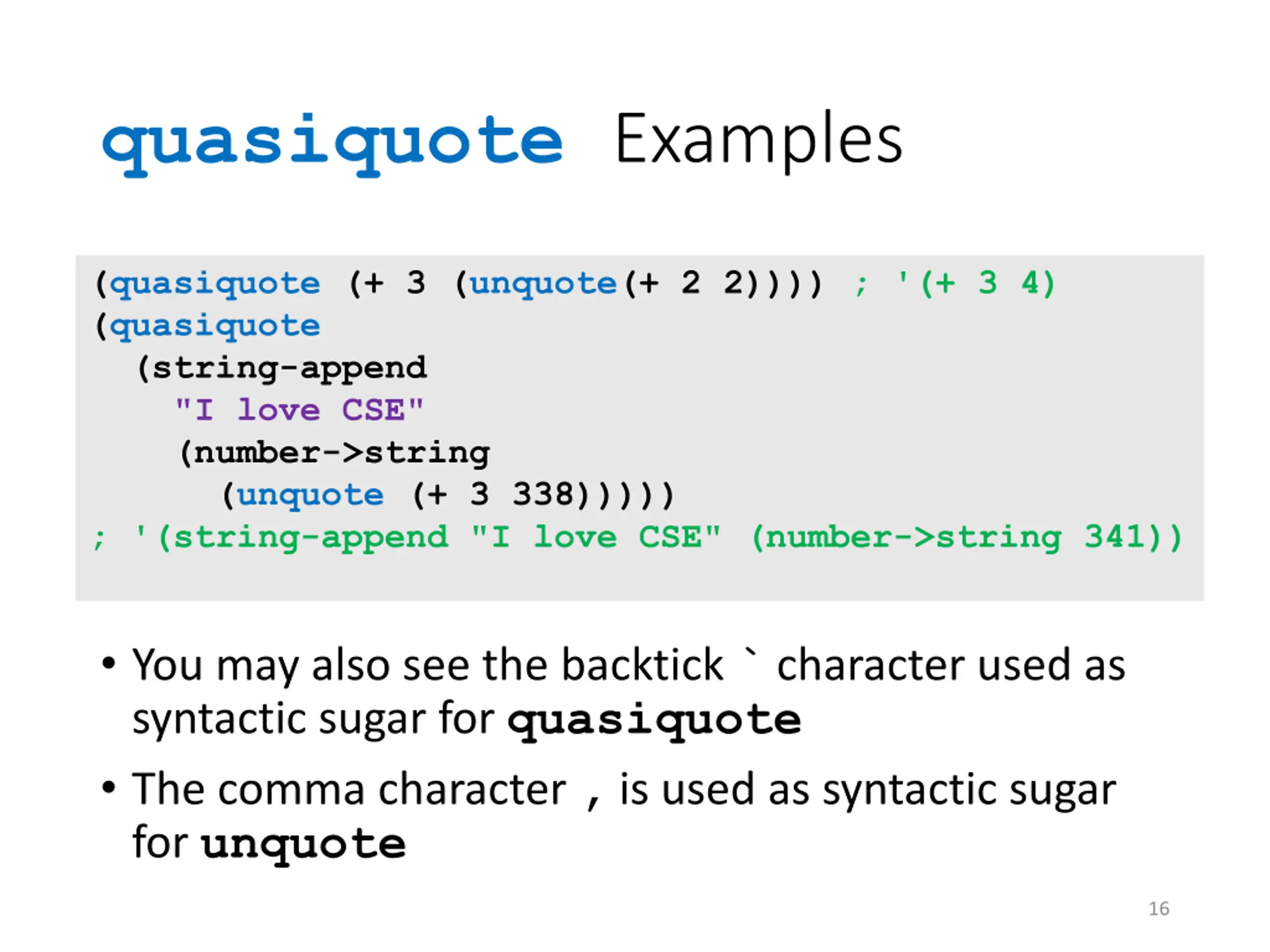 quasiquote Examples (quasiquote (+ 3 (unquote(+ 2 2)))) ; '(+ 3 4) (quasiquote (string-append "I love CSE" (number->string (unquote (+ 3 338))))) ; '(string-append "I love CSE" (number->string 341)) You may also see the backtick ` character used as syntactic sugar for quasiquote The comma character , is used as syntactic sugar for unquote 16