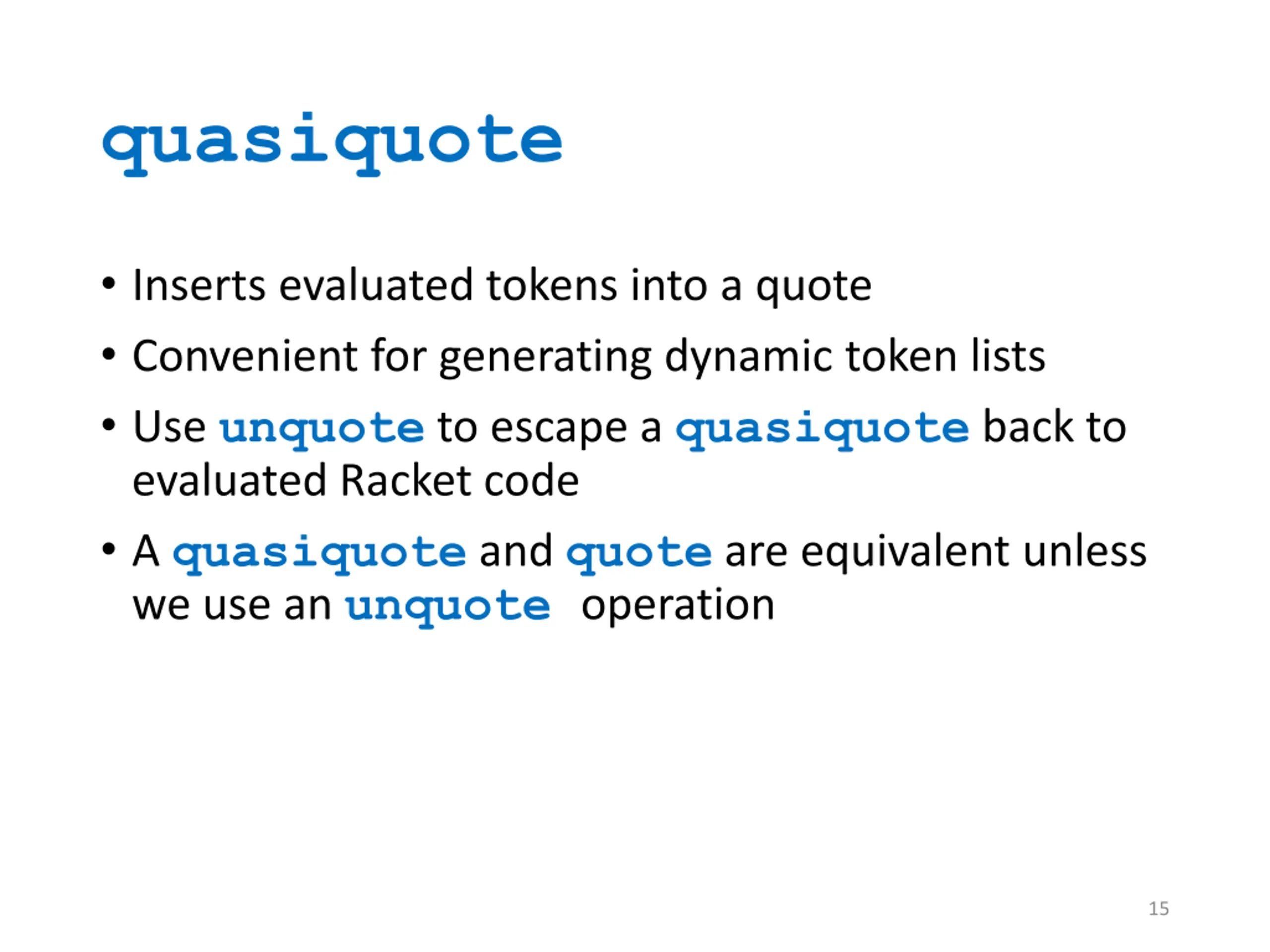 quasiquote Inserts evaluated tokens into a quote Convenient for generating dynamic token lists Use unquote to escape a quasiquote back to evaluated Racket code A quasiquote and quote are equivalent unless we use an unquote operation 15