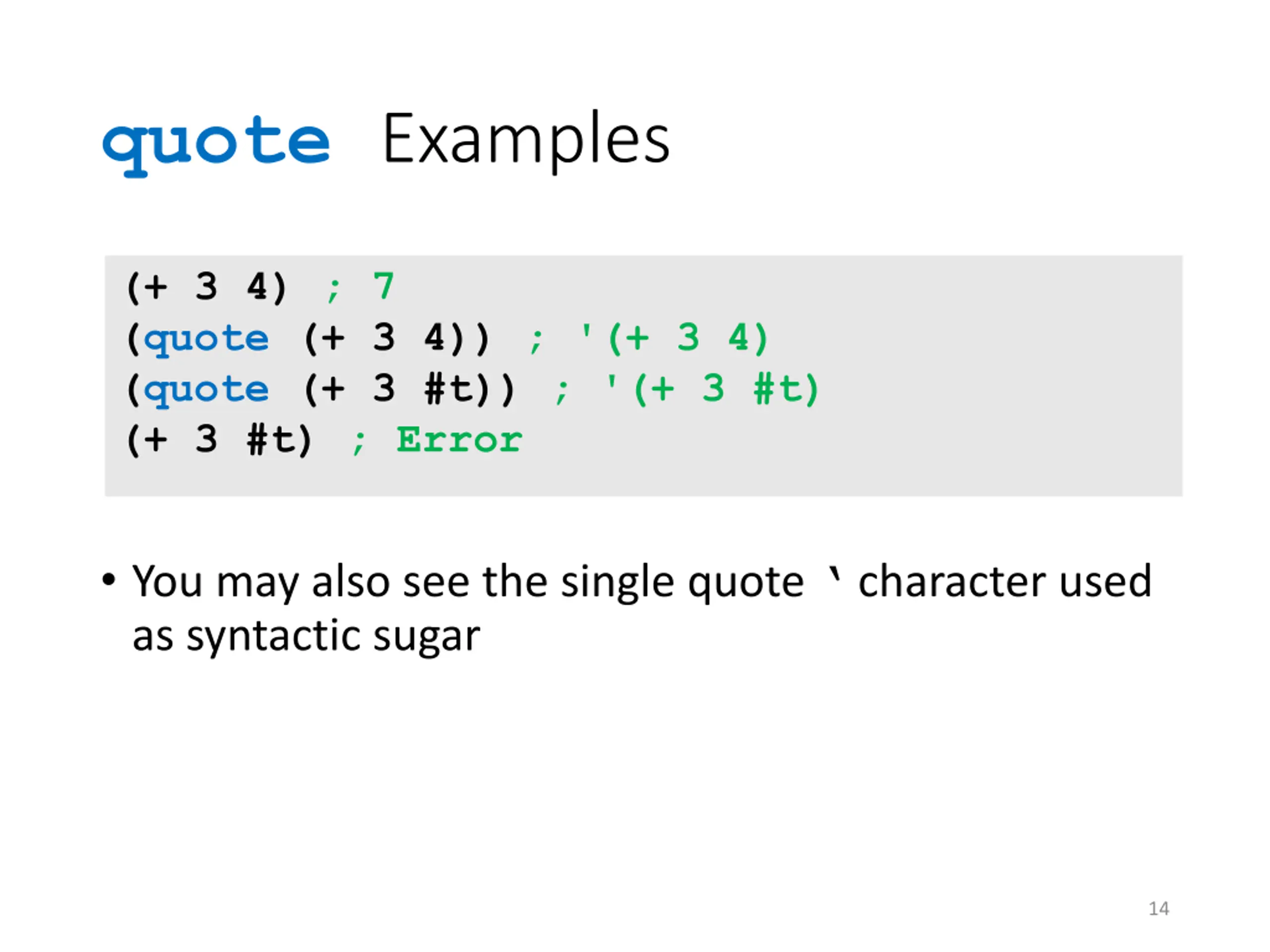 quote Examples (+ 3 4) ; 7 (quote (+ 3 4)) ; '(+ 3 4) (quote (+ 3 #t)) ; '(+ 3 #t) (+ 3 #t) ; Error You may also see the single quote character used as syntactic sugar 14