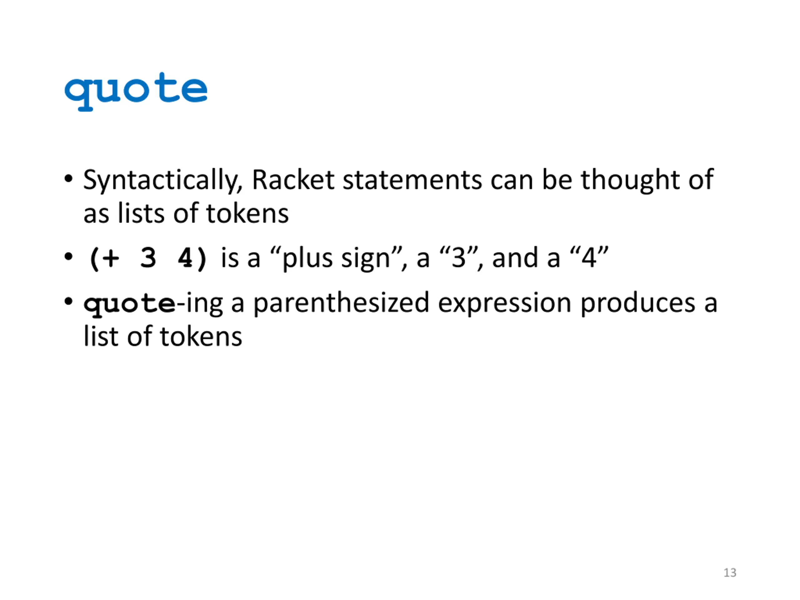 quote Syntactically, Racket statements can be thought of as lists of tokens (+ 3 4) is a plus sign , a 3 , and a 4 quote-ing a parenthesized expression produces a list of tokens 13