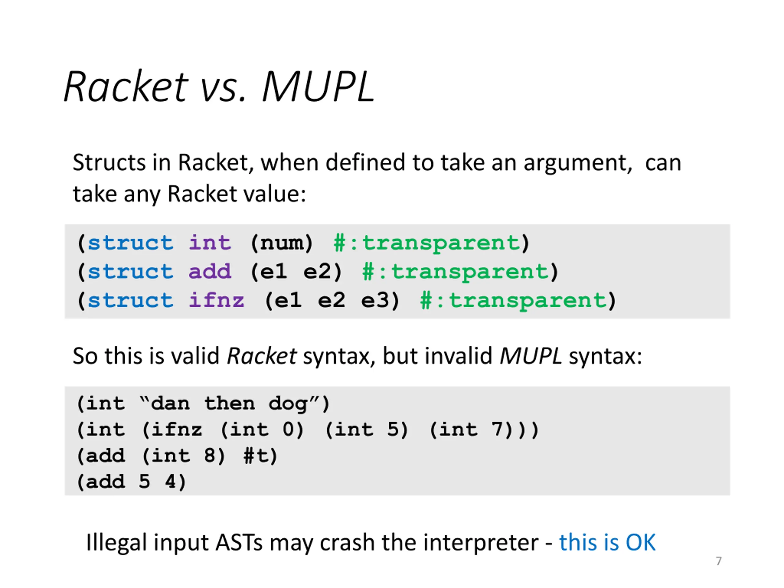 Racket vs. MUPL Structs in Racket, when defined to take an argument, can take any Racket value: (struct int (num) #:transparent) (struct add (e1 e2) #:transparent) (struct ifnz (e1 e2 e3) #:transparent) So this is valid Racket syntax, but invalid MUPL syntax: (int dan then dog ) (int (ifnz (int 0) (int 5) (int 7))) (add (int 8) #t) (add 5 4) Illegal input ASTs may crash the interpreter - this is OK 7