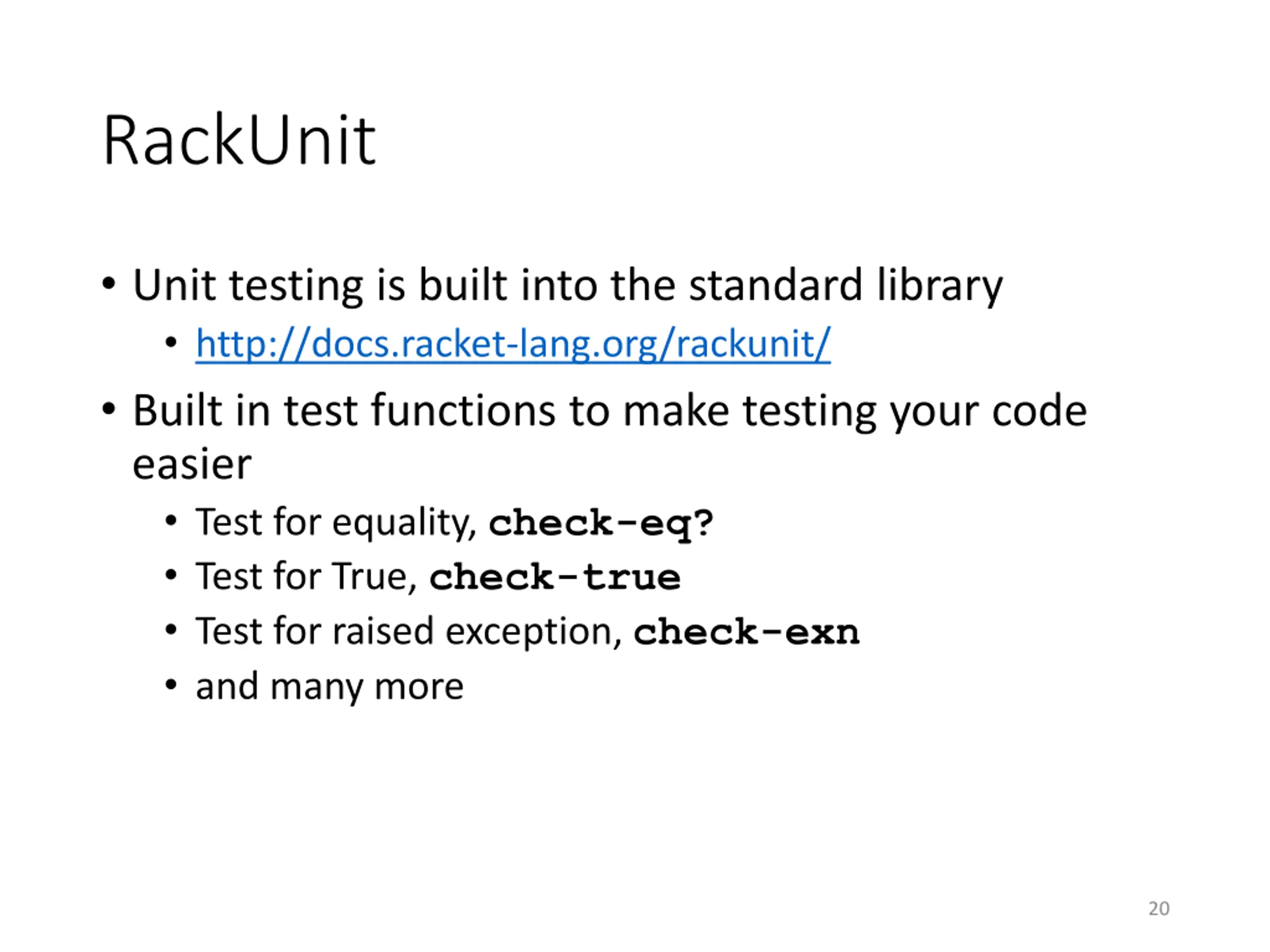 RackUnit Unit testing is built into the standard library http://docs.racket-lang.org/rackunit/ Built in test functions to make testing your code easier Test for equality, check-eq? Test for True, check-true Test for raised exception, check-exn and many more 20