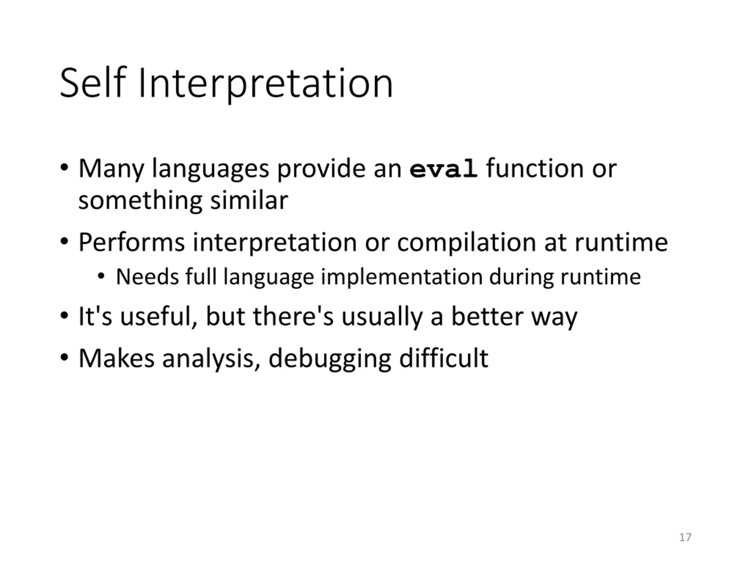 Self Interpretation Many languages provide an eval function or something similar Performs interpretation or compilation at runtime Needs full language implementation during runtime It's useful, but there's usually a better way Makes analysis, debugging difficult 17