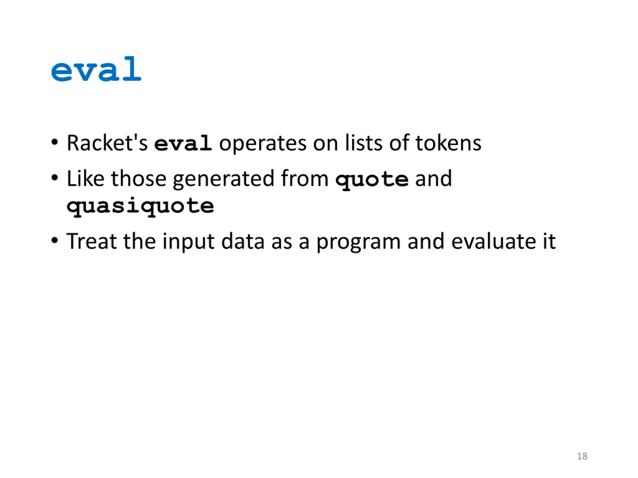 eval Racket's eval operates on lists of tokens Like those generated from quote and quasiquote Treat the input data as a program and evaluate it 18
