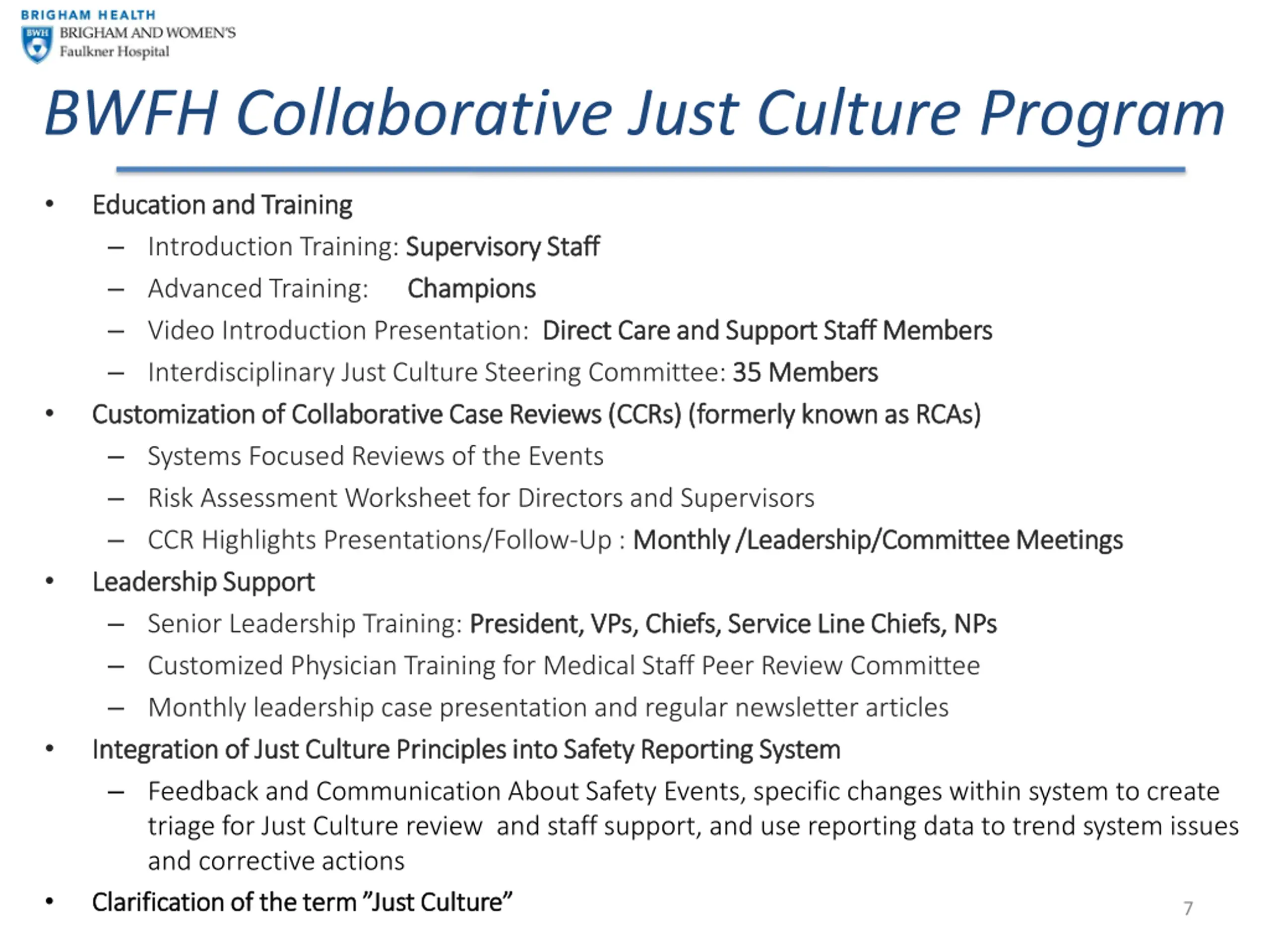 BWFH Collaborative Just Culture Program Education and Training Education and Training Introduction Training: Supervisory Staff Advanced Training: Video Introduction Presentation: Direct Care and Support Staff Members Direct Care and Support Staff Members Interdisciplinary Just Culture Steering Committee: 35 Members Customization of Collaborative Case Reviews (CCRs) (formerly known as RCAs) Customization of Collaborative Case Reviews (CCRs) (formerly known as RCAs) Systems Focused Reviews of the Events Risk Assessment Worksheet for Directors and Supervisors CCR Highlights Presentations/Follow-Up : Monthly /Leadership/Committee Meetings Leadership Support Leadership Support Senior Leadership Training: President, VPs, Chiefs, Service Line Chiefs, NPs President, VPs, Chiefs, Service Line Chiefs, NPs Customized Physician Training for Medical Staff Peer Review Committee Monthly leadership case presentation and regular newsletter articles Integration of Just Culture Principles into Safety Reporting System Integration of Just Culture Principles into Safety Reporting System Feedback and Communication About Safety Events, specific changes within system to create triage for Just Culture review and staff support, and use reporting data to trend system issues and corrective actions Clarification of the term Just Culture Clarification of the term Just Culture Supervisory Staff Champions Champions 35 Members Monthly /Leadership/Committee Meetings 7