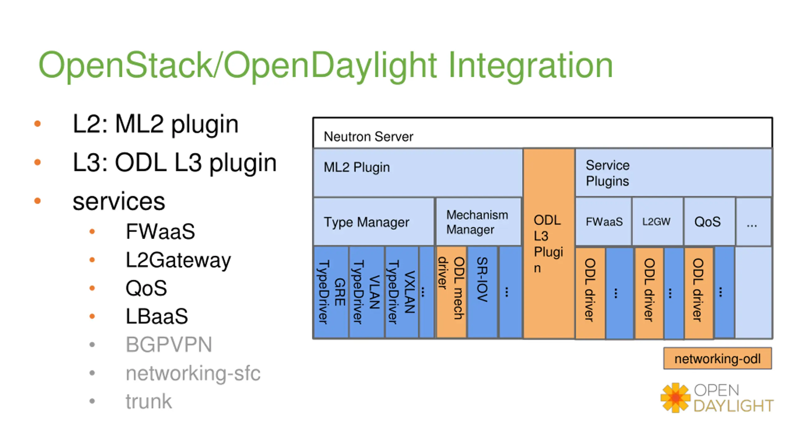 OpenStack/OpenDaylight Integration L2: ML2 plugin L3: ODL L3 plugin services FWaaS L2Gateway QoS LBaaS BGPVPN networking-sfc trunk Neutron Server Service Plugins ML2 Plugin Mechanism Manager ODL L3 Plugi n QoS Type Manager ... FWaaS L2GW driver ODL mech SR-IOV ODL driver ODL driver ODL driver TypeDriver TypeDriver TypeDriver VXLAN VLAN GRE ... ... ... ... ... networking-odl
