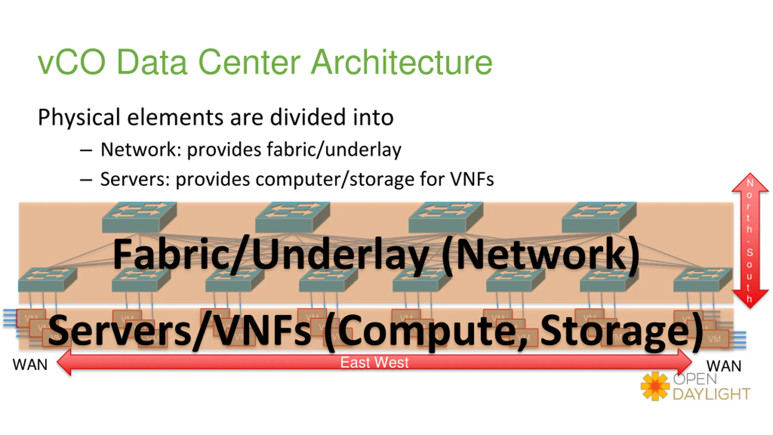 vCO Data Center Architecture Physical elements are divided into Network: provides fabric/underlay Servers: provides computer/storage for VNFs N o r t h - S o u t h Fabric/Underlay (Network) VM Servers/VNFs (Compute, Storage) VM VM VM VM VM VM VM VM VM VM VM VM VM VM VM VM VM VM VM VM VM VM VM East West WAN WAN