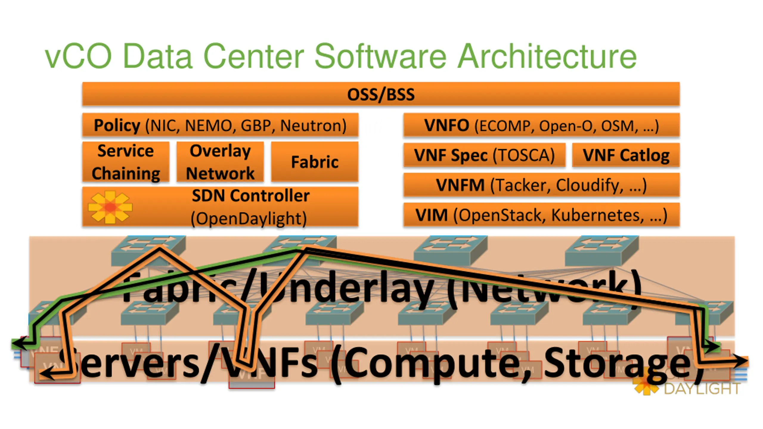 vCO Data Center Software Architecture OSS/BSS Policy (NIC, NEMO, GBP, Neutron) VNFO (ECOMP, Open-O, OSM, ) Service Chaining Overlay Network VNF Spec (TOSCA) VNF Catlog Fabric VNFM (Tacker, Cloudify, ) SDN Controller (OpenDaylight) VIM (OpenStack, Kubernetes, ) Fabric/Underlay (Network) VM Servers/VNFs (Compute, Storage) VM VNF VNF VNF VM VM VM VM VM VM VM VM VM VM VM VM VM VM VM VNF VM VNF VM VM VM VM VM VM