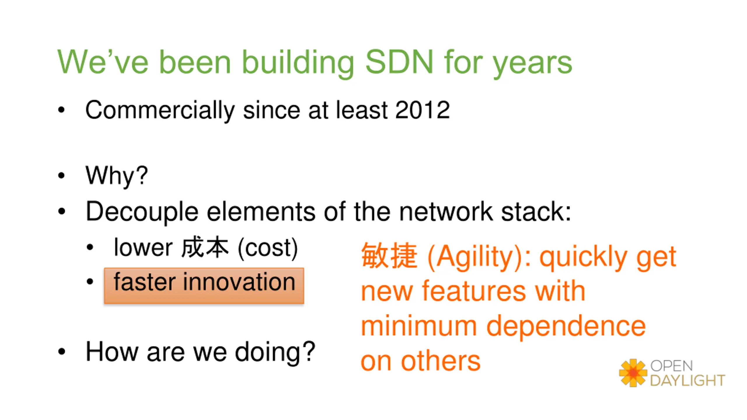 Weve been building SDN for years Commercially since at least 2012 Why? Decouple elements of the network stack: lower (cost) faster innovation (Agility): quickly get new features with minimum dependence on others How are we doing?