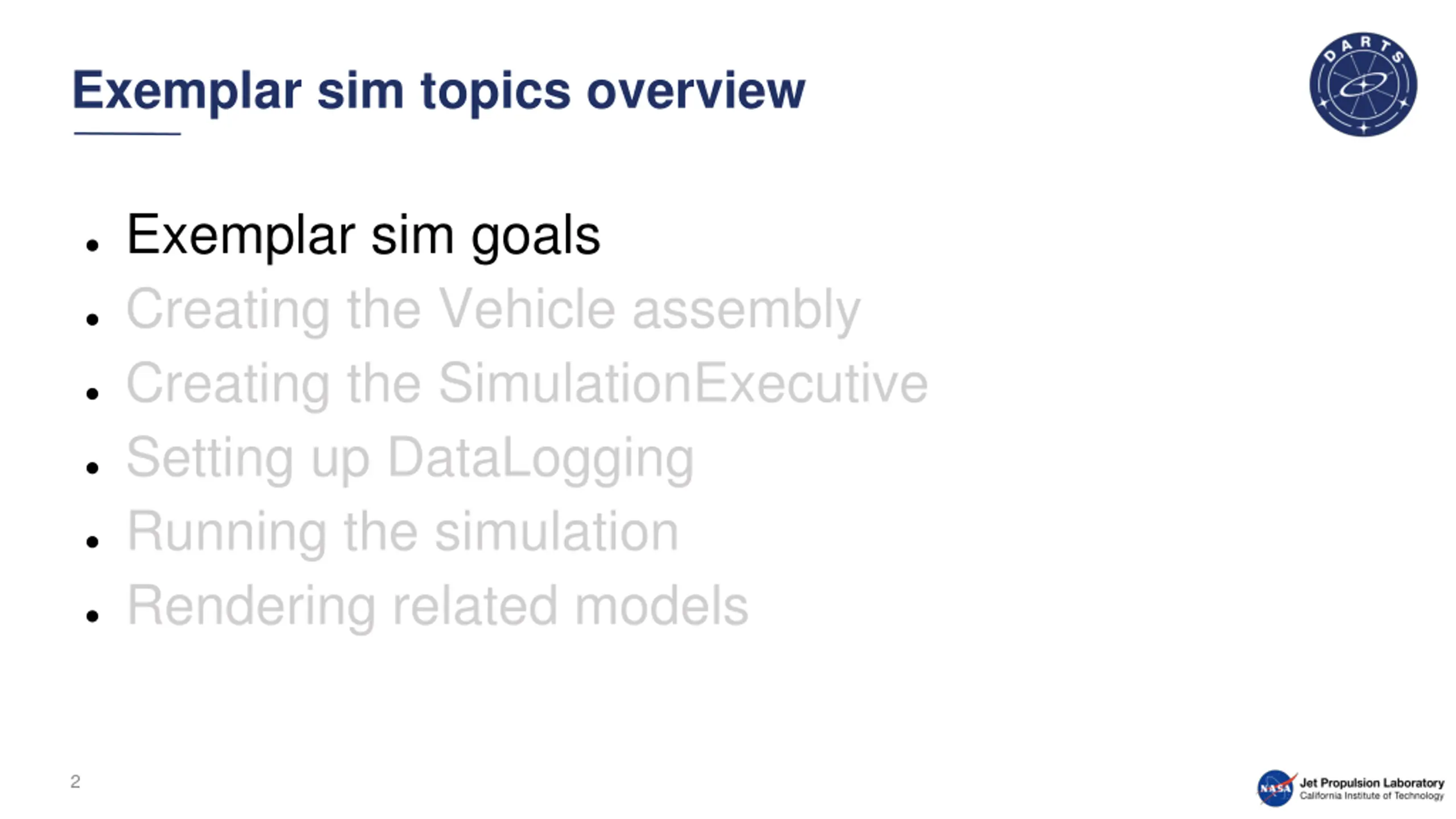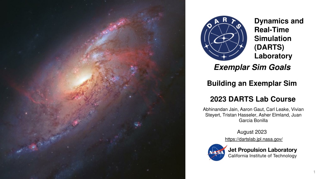 Dynamics and Real-Time Simulation (DARTS) Laboratory Exemplar Sim Goals Building an Exemplar Sim 2023 DARTS Lab Course Abhinandan Jain, Aaron Gaut, Carl Leake, Vivian Steyert, Tristan Hasseler, Asher Elmland, Juan Garcia Bonilla August 2023 https://dartslab.jpl.nasa.gov/ https://dartslab.jpl.nasa.gov/ 1