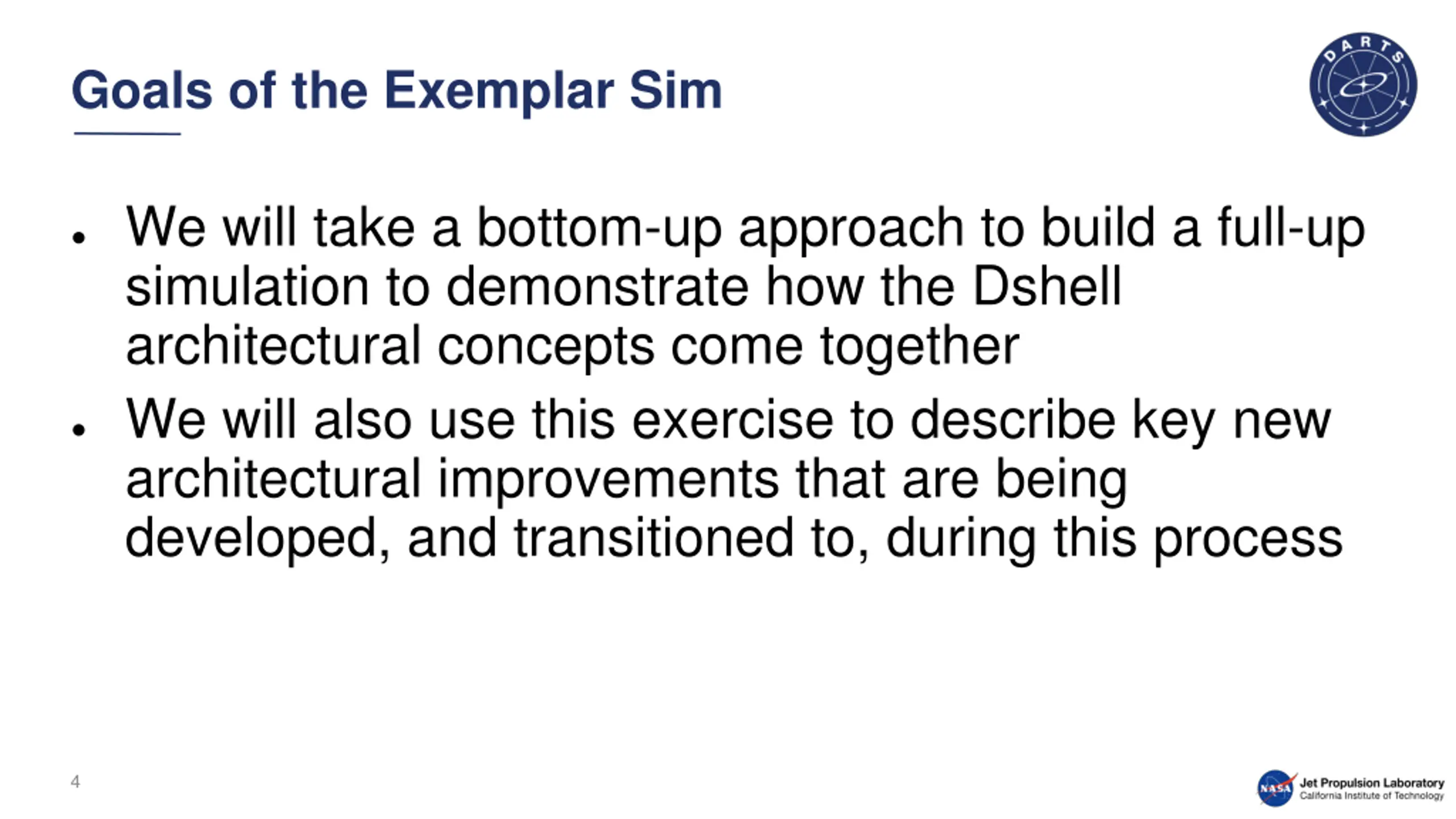 Goals of the Exemplar Sim We will take a bottom-up approach to build a full-up simulation to demonstrate how the Dshell architectural concepts come together We will also use this exercise to describe key new architectural improvements that are being developed, and transitioned to, during this process 4