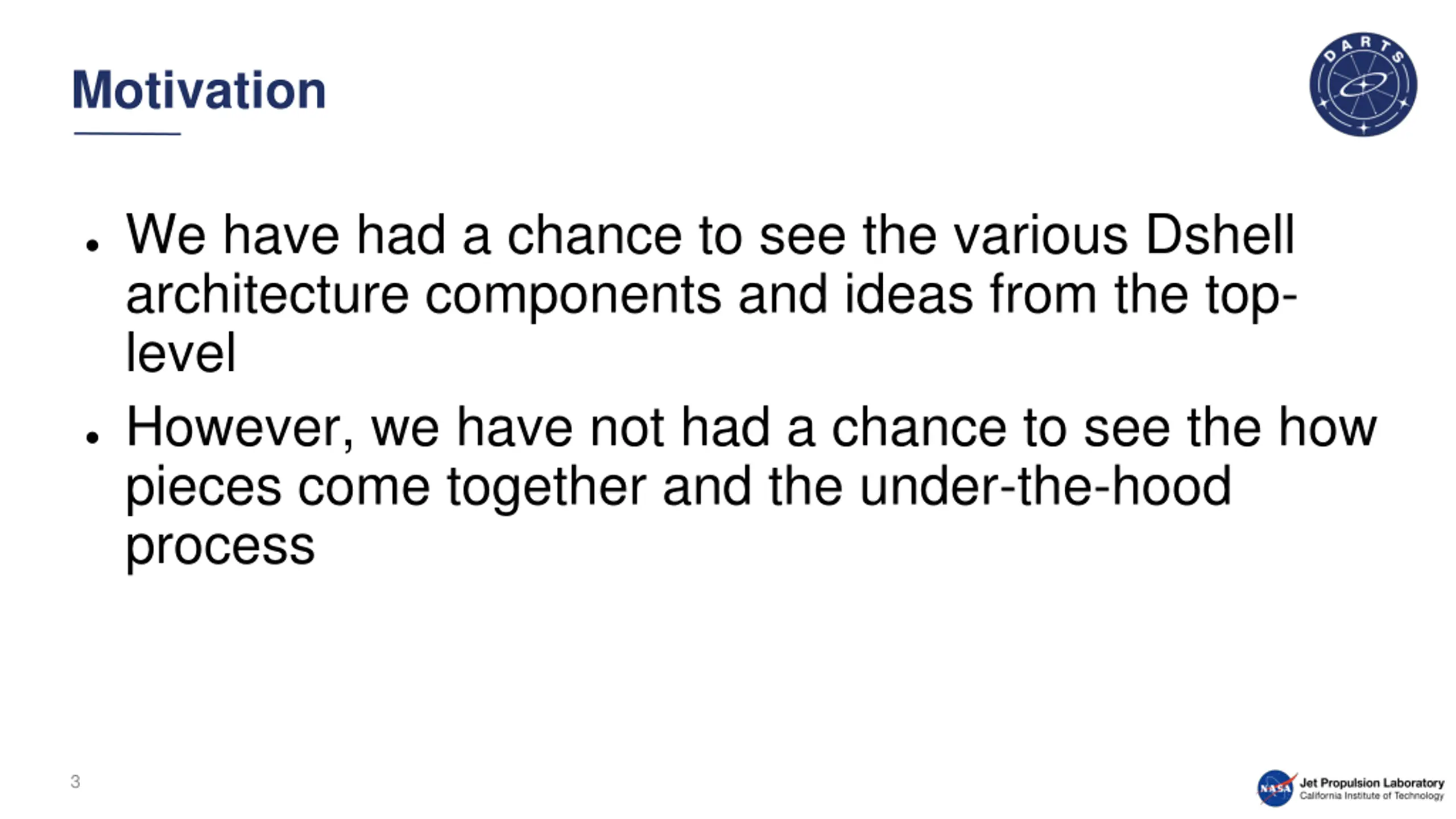 Motivation We have had a chance to see the various Dshell architecture components and ideas from the top- level However, we have not had a chance to see the how pieces come together and the under-the-hood process 3