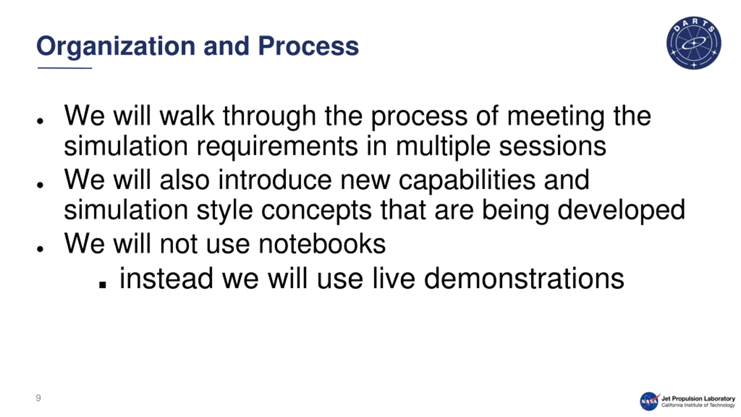 Organization and Process We will walk through the process of meeting the simulation requirements in multiple sessions We will also introduce new capabilities and simulation style concepts that are being developed We will not use notebooks instead we will use live demonstrations 9