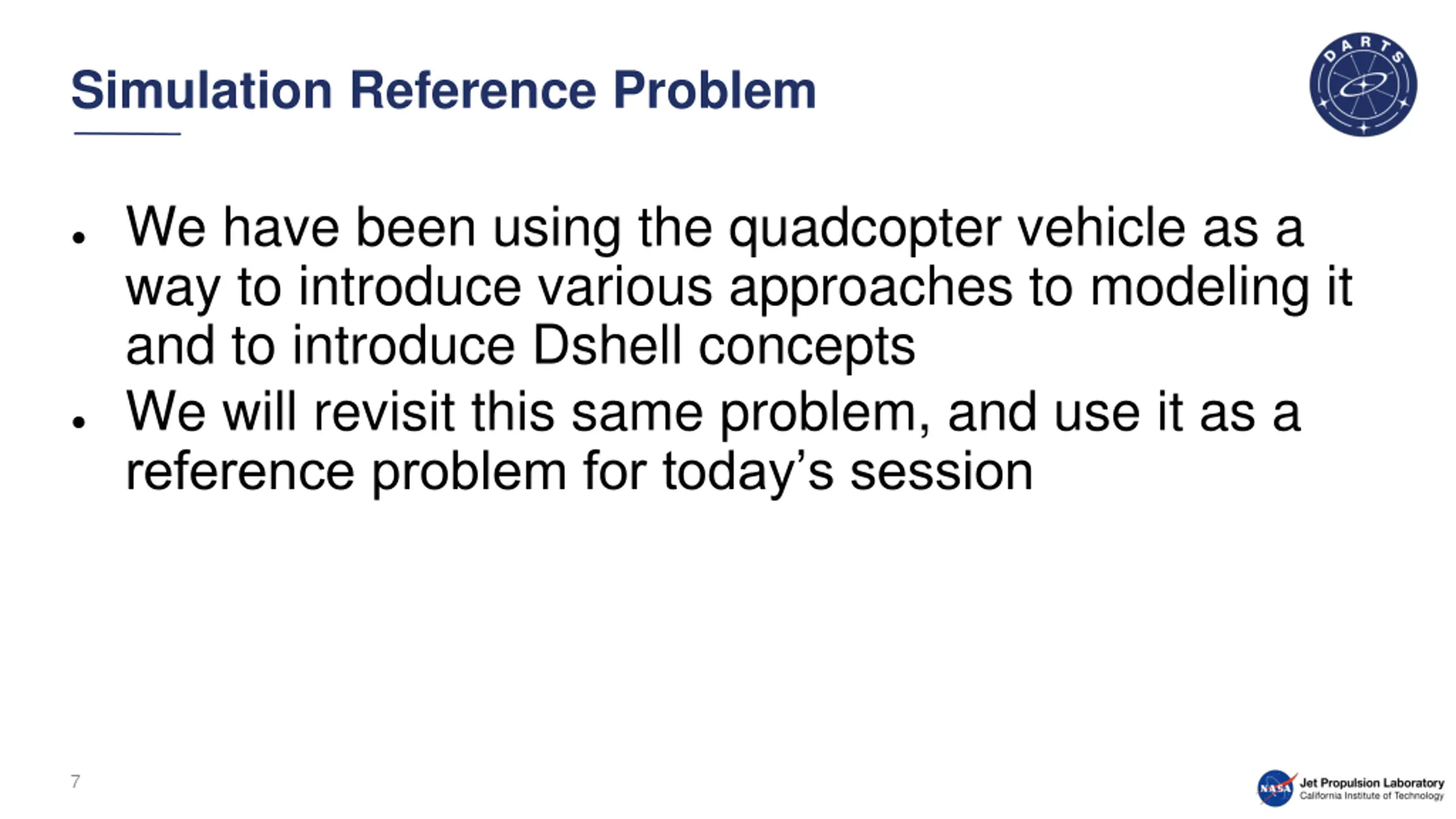 Simulation Reference Problem We have been using the quadcopter vehicle as a way to introduce various approaches to modeling it and to introduce Dshell concepts We will revisit this same problem, and use it as a reference problem for today s session 7