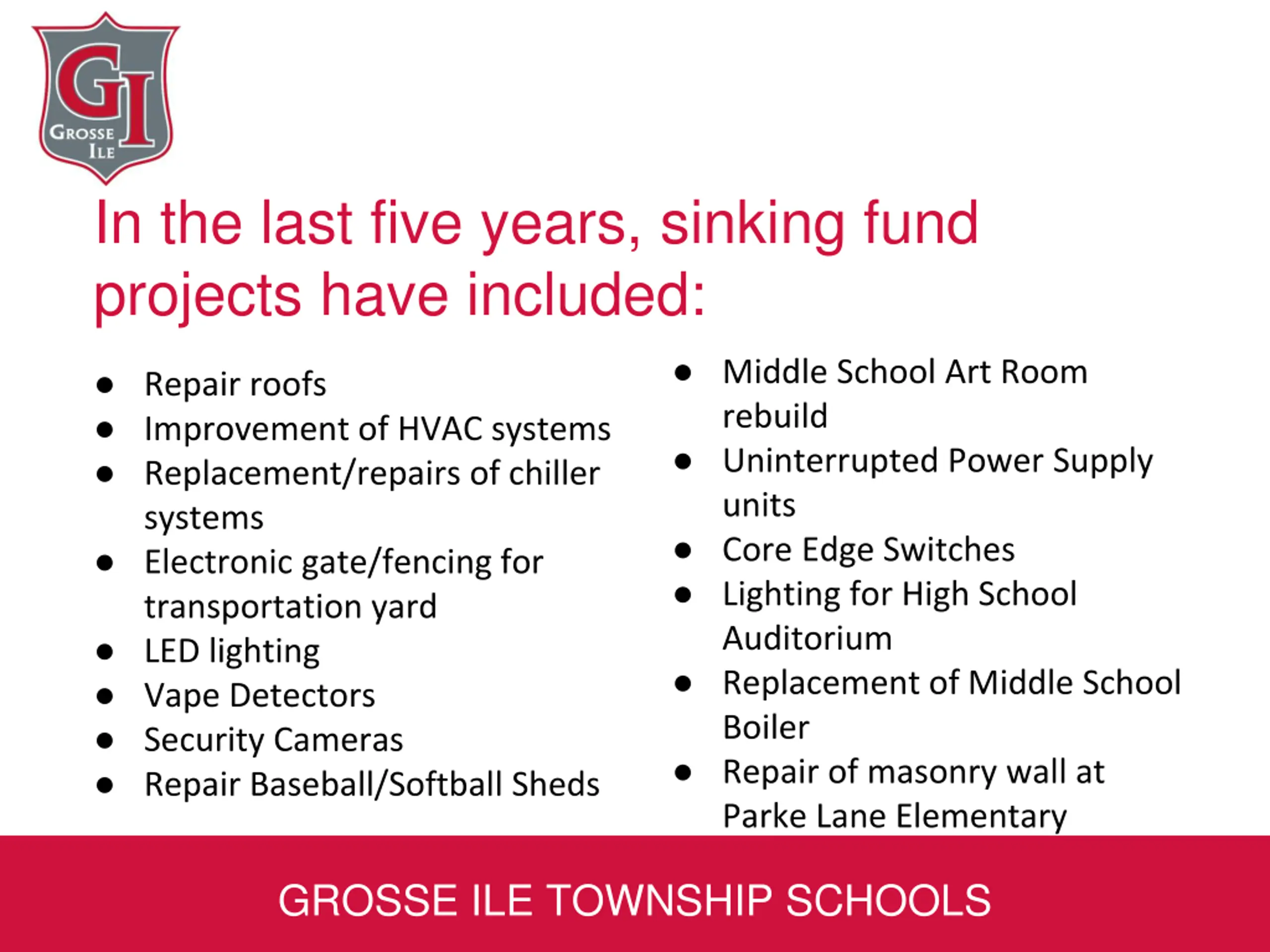 In previous years, sinking fund revenue has provided funding for facility repairs, renovations, replacement projects and more recently (within the last 5 years) technology enhancements within the district. GROSSE ILE TOWNSHIP SCHOOLS