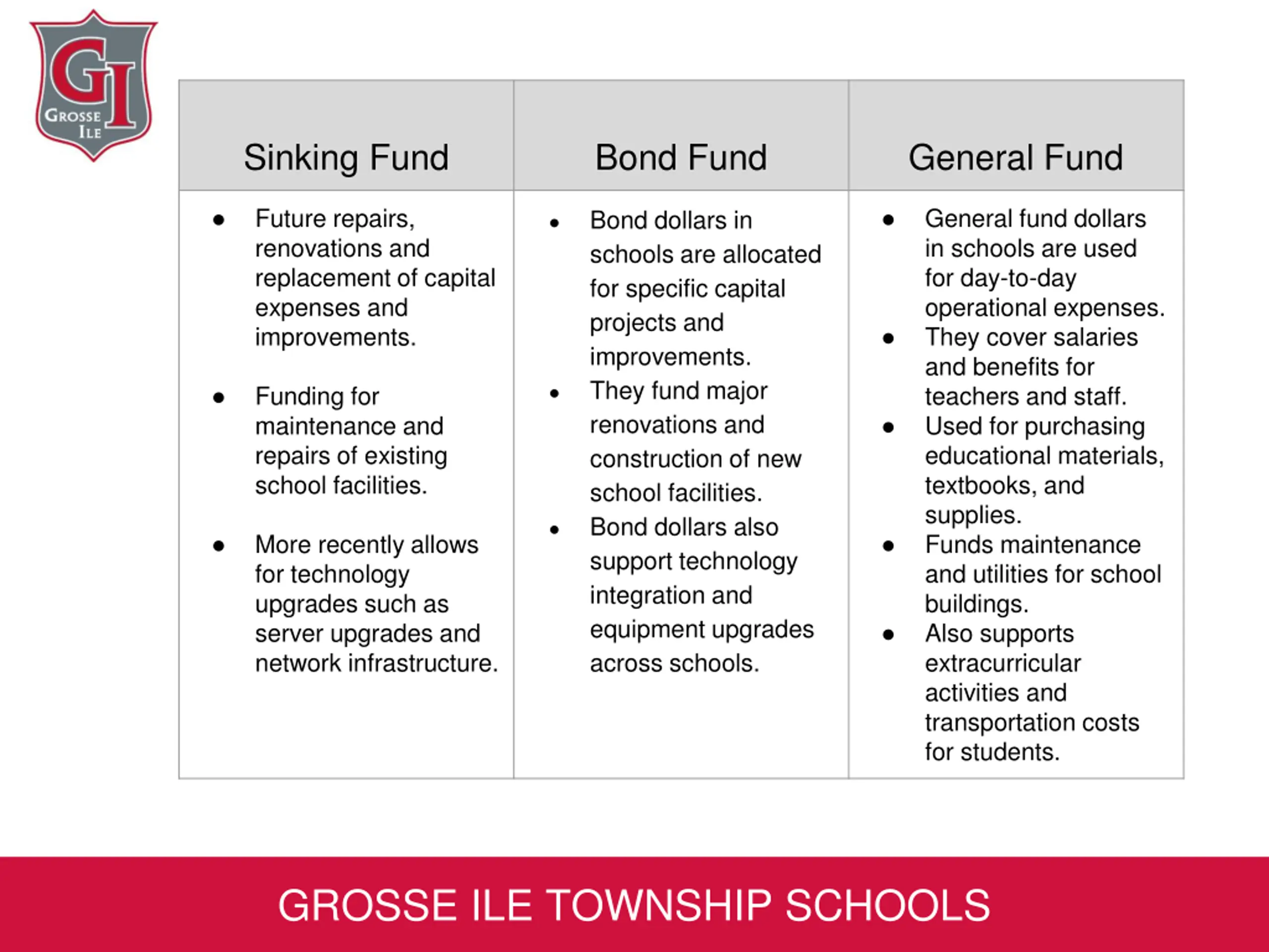 Sinking Fund Bond Fund General Fund Future repairs, renovations and replacement of capital expenses and improvements. General fund dollars in schools are used for day-to-day operational expenses. They cover salaries and benefits for teachers and staff. Used for purchasing educational materials, textbooks, and supplies. Funds maintenance and utilities for school buildings. Also supports extracurricular activities and transportation costs for students. Bond dollars in schools are allocated for specific capital projects and improvements. They fund major renovations and construction of new school facilities. Bond dollars also support technology integration and equipment upgrades across schools. Funding for maintenance and repairs of existing school facilities. More recently allows for technology upgrades such as server upgrades and network infrastructure. RICHMOND COMMUNITY SCHOOLS GROSSE ILE TOWNSHIP SCHOOLS