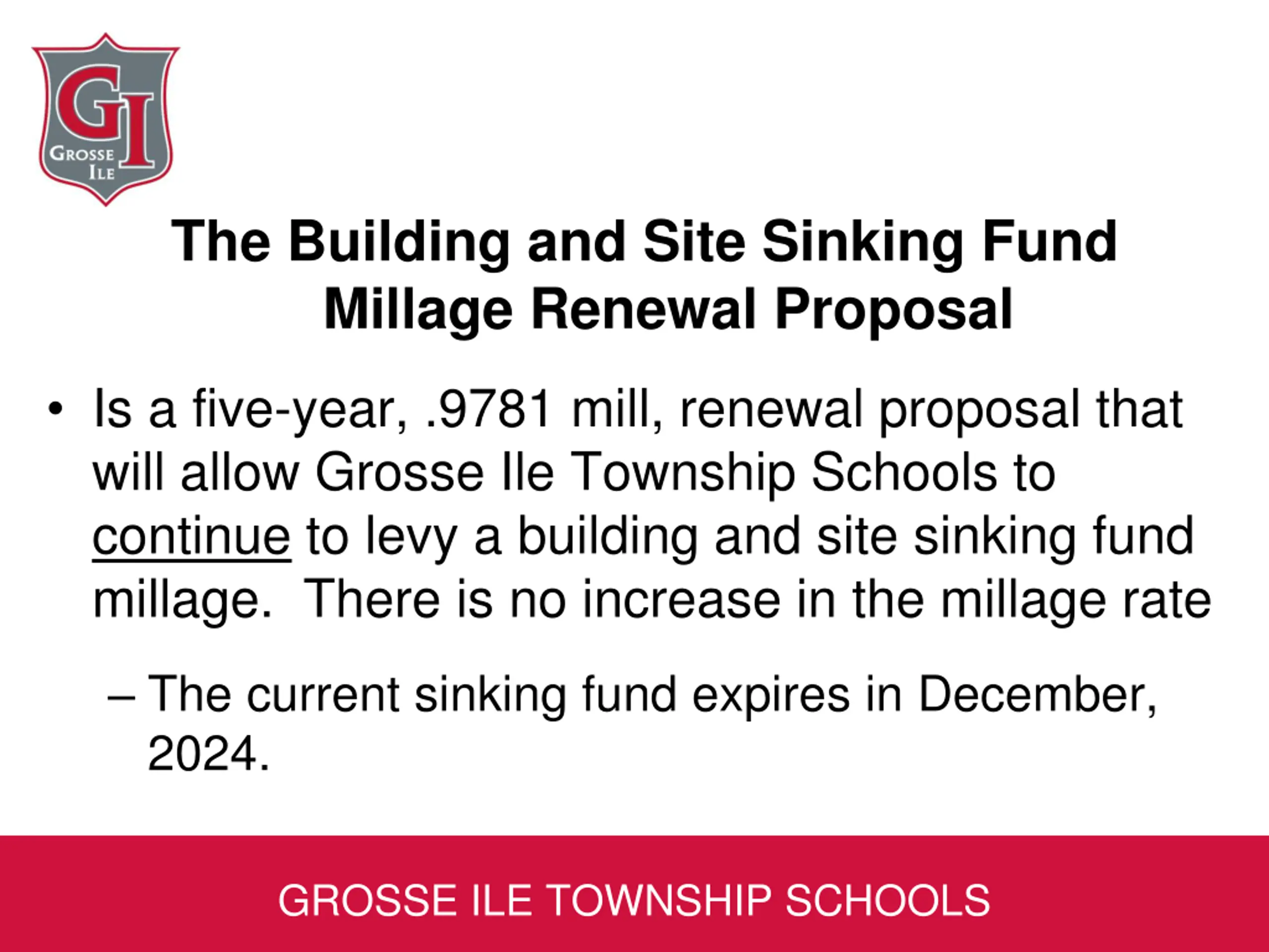 The Building and Site Sinking Fund Millage Renewal Proposal Is a five-year, .9781 mill, renewal proposal that will allow Grosse Ile Township Schools to continue to levy a building and site sinking fund millage. There is no increase in the millage rate The current sinking fund expires in December, 2024. GROSSE ILE TOWNSHIP SCHOOLS