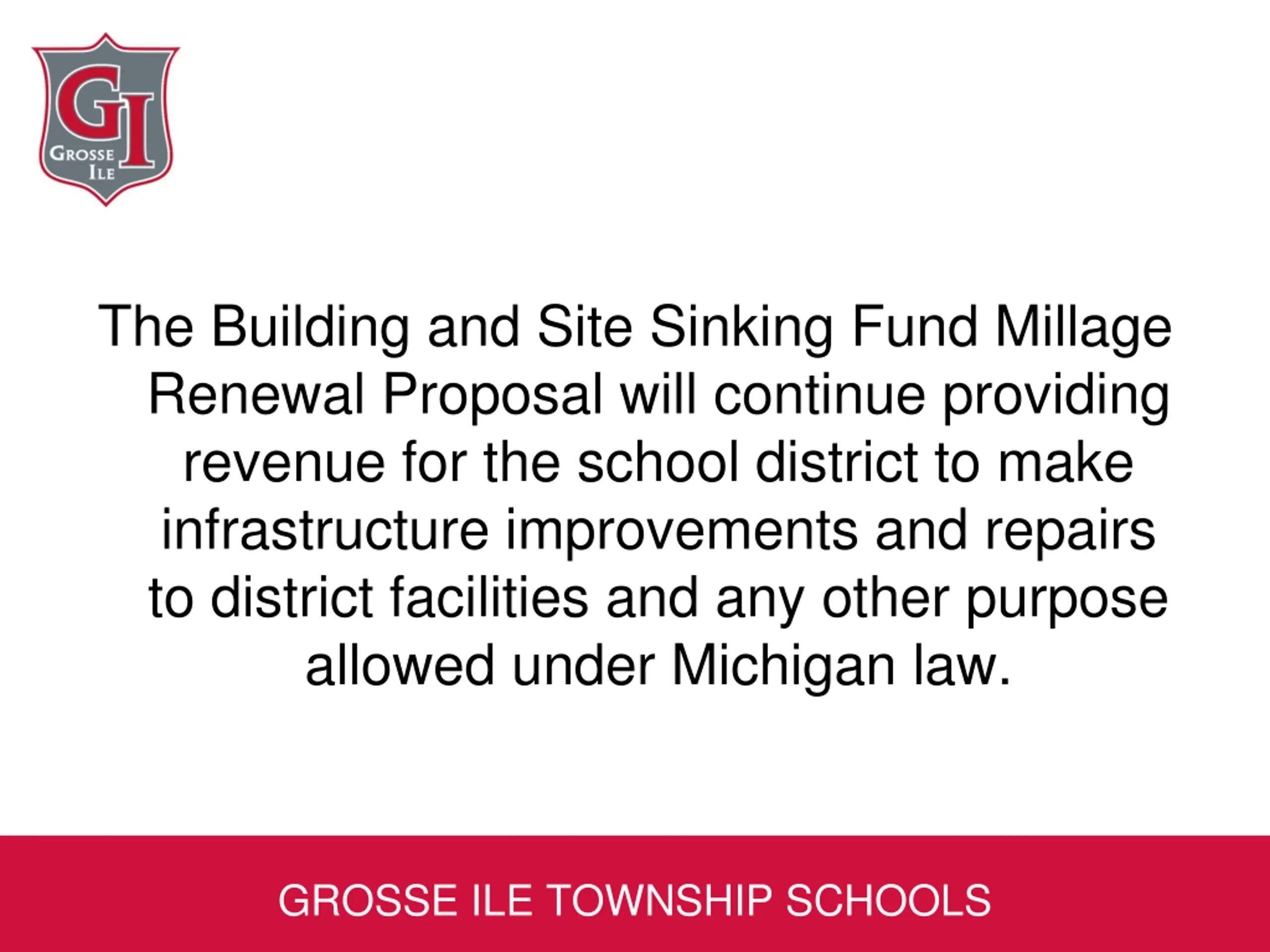 The Building and Site Sinking Fund Millage Renewal Proposal will continue providing revenue for the school district to make infrastructure improvements and repairs to district facilities and any other purpose allowed under Michigan law. GROSSE ILE TOWNSHIP SCHOOLS