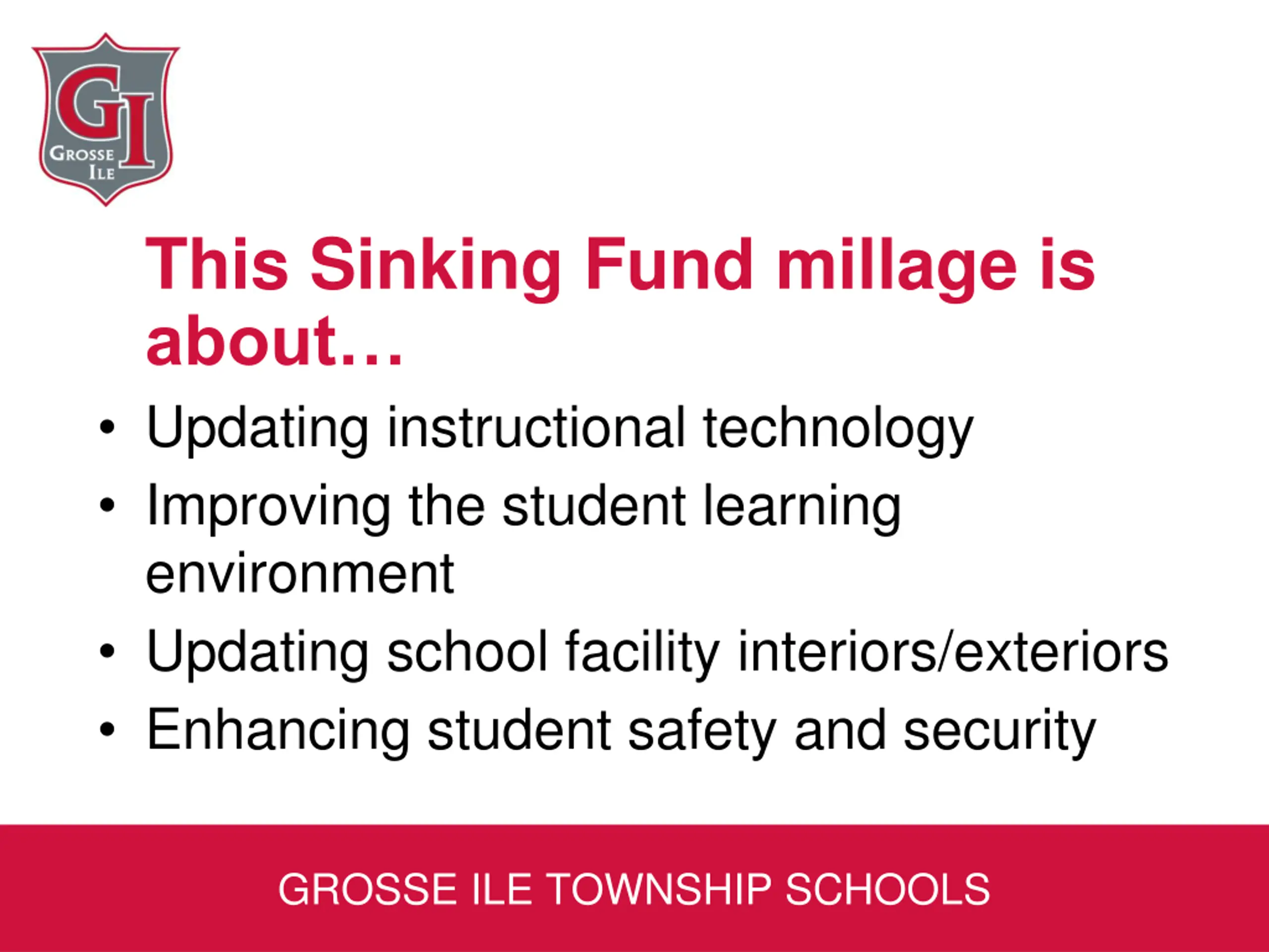 This Sinking Fund millage is about Updating instructional technology Improving the student learning environment Updating school facility interiors/exteriors Enhancing student safety and security GROSSE ILE TOWNSHIP SCHOOLS