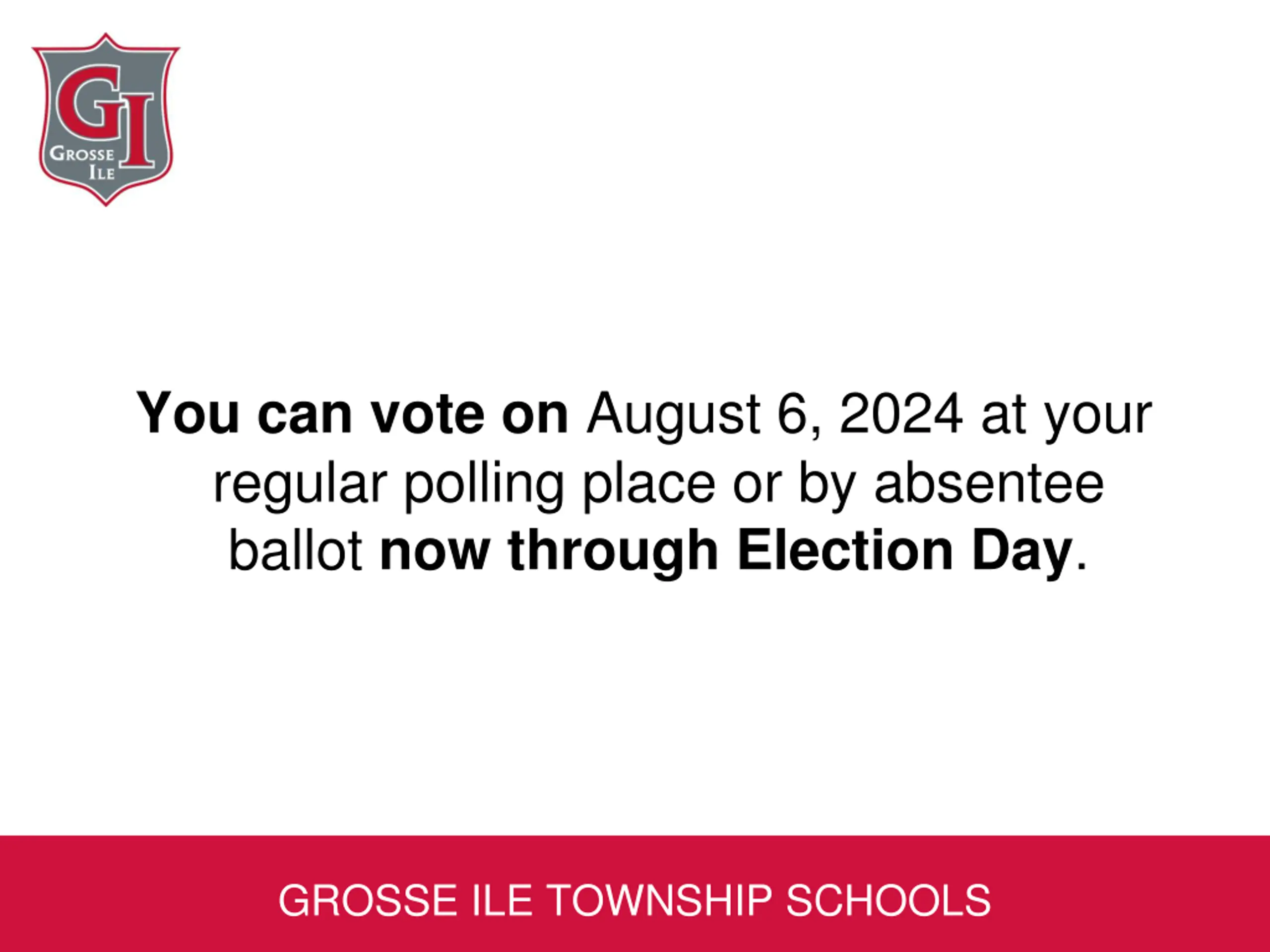 You can vote on August 6, 2024 at your regular polling place or by absentee ballot now through Election Day. RICHMOND COMMUNITY SCHOOLS GROSSE ILE TOWNSHIP SCHOOLS