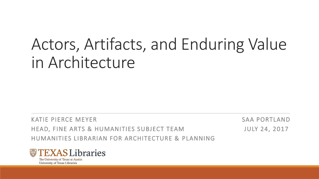 Actors, Artifacts, and Enduring Value in Architecture KATIE PIERCE MEYER KATIE PIERCE MEYER HEAD, FINE ARTS & HUMANITIES SUBJECT TEAM HEAD, FINE ARTS & HUMANITIES SUBJECT TEAM HUMANITIES LIBRARIAN FOR ARCHITECTURE & HUMANITIES LIBRARIAN FOR ARCHITECTURE & PLANNING SAA PORTLAND SAA PORTLAND JULY 24, 2017 JULY 24, 2017 PLANNING