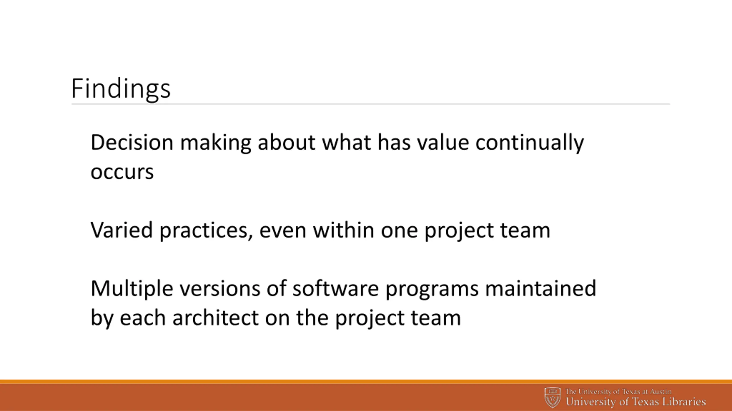 Findings Decision making about what has value continually occurs Varied practices, even within one project team Multiple versions of software programs maintained by each architect on the project team
