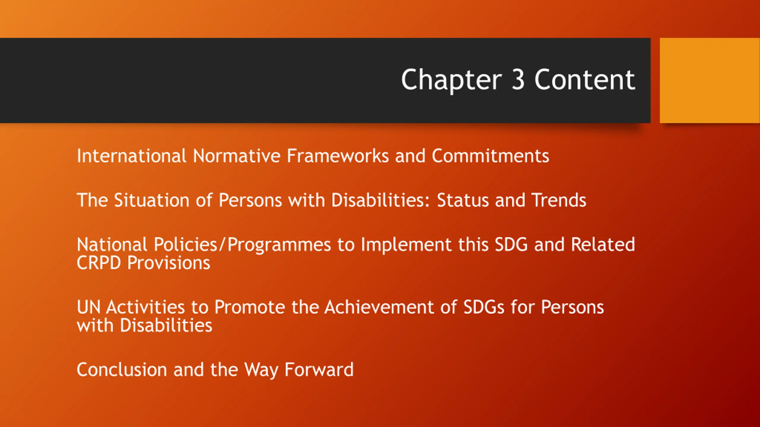 Chapter 3 Content International Normative Frameworks and Commitments The Situation of Persons with Disabilities: Status and Trends National Policies/Programmes to Implement this SDG and Related CRPD Provisions UN Activities to Promote the Achievement of SDGs for Persons with Disabilities Conclusion and the Way Forward
