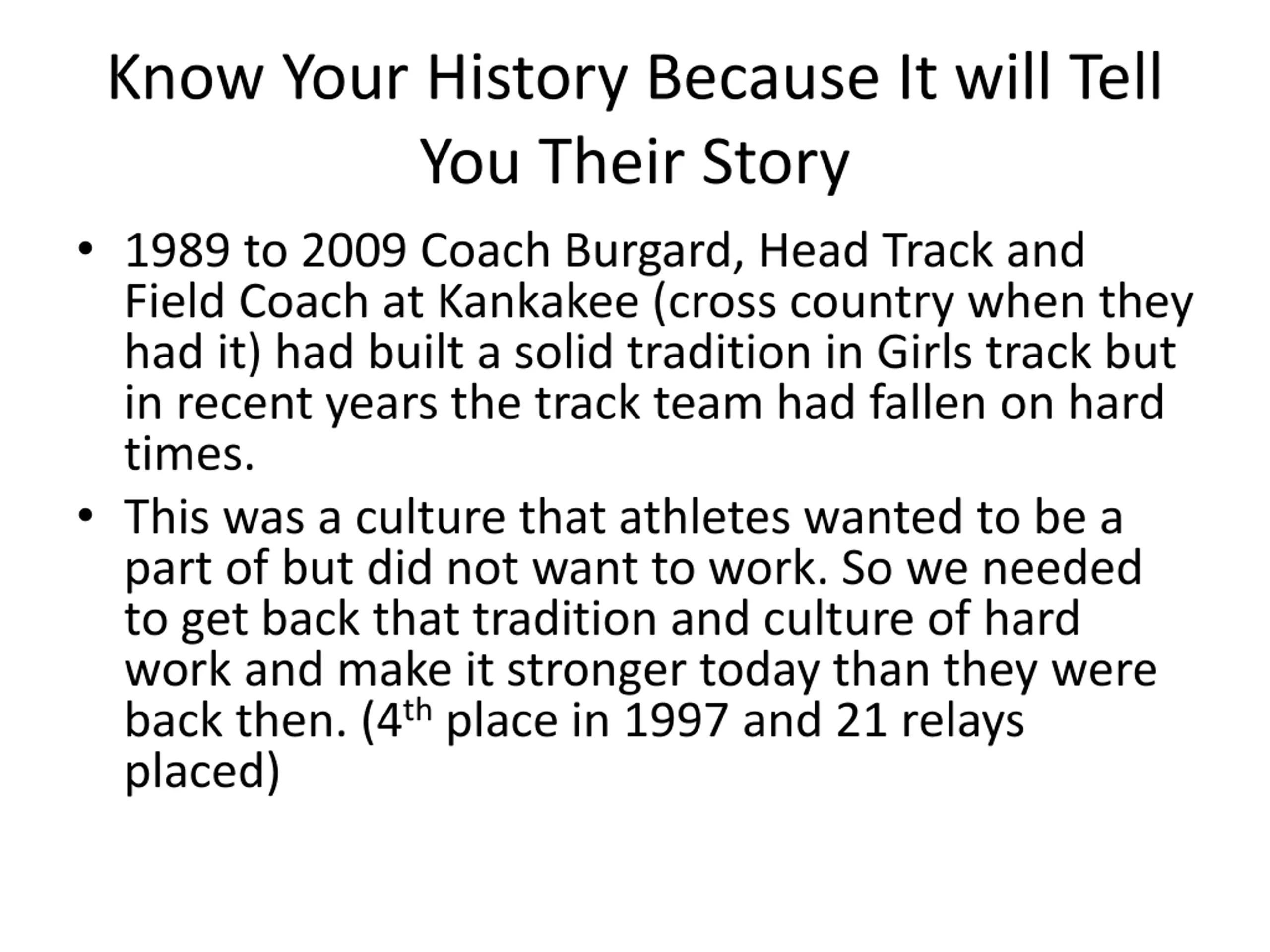 Know Your History Because It will Tell You Their Story 1989 to 2009 Coach Burgard, Head Track and Field Coach at Kankakee (cross country when they had it) had built a solid tradition in Girls track but in recent years the track team had fallen on hard times. This was a culture that athletes wanted to be a part of but did not want to work. So we needed to get back that tradition and culture of hard work and make it stronger today than they were back then. (4thplace in 1997 and 21 relays placed)