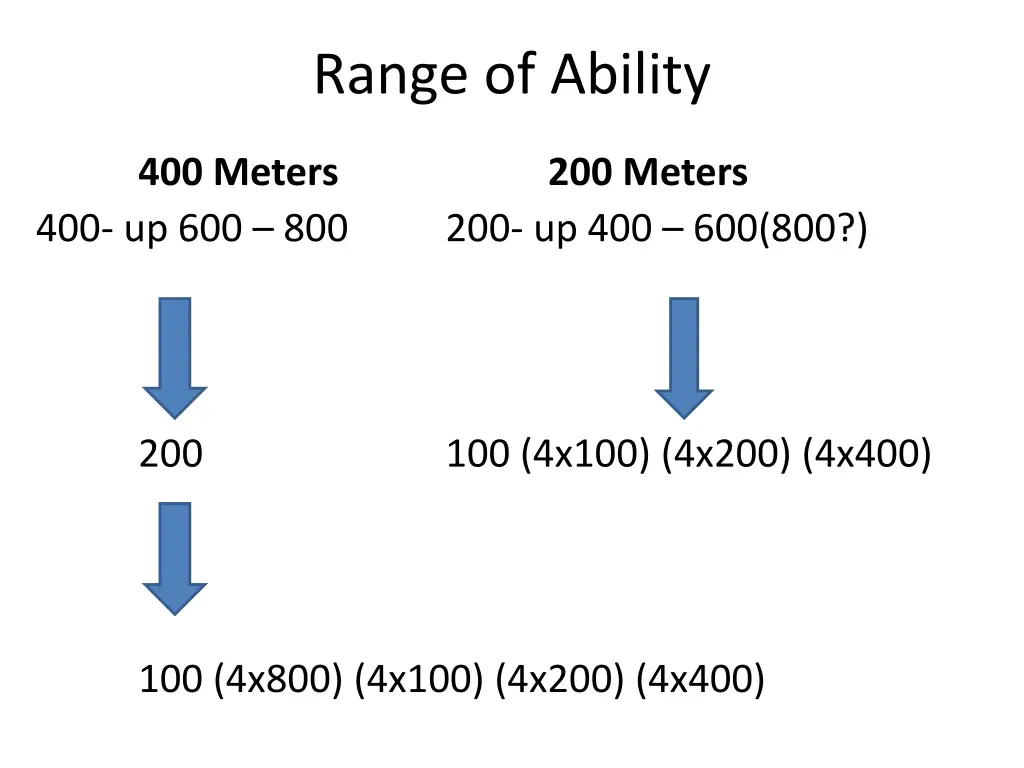 Range of Ability 400 Meters 400- up 600 800 200 Meters 200- up 400 600(800?) 200 100 (4x100) (4x200) (4x400) 100 (4x800) (4x100) (4x200) (4x400)