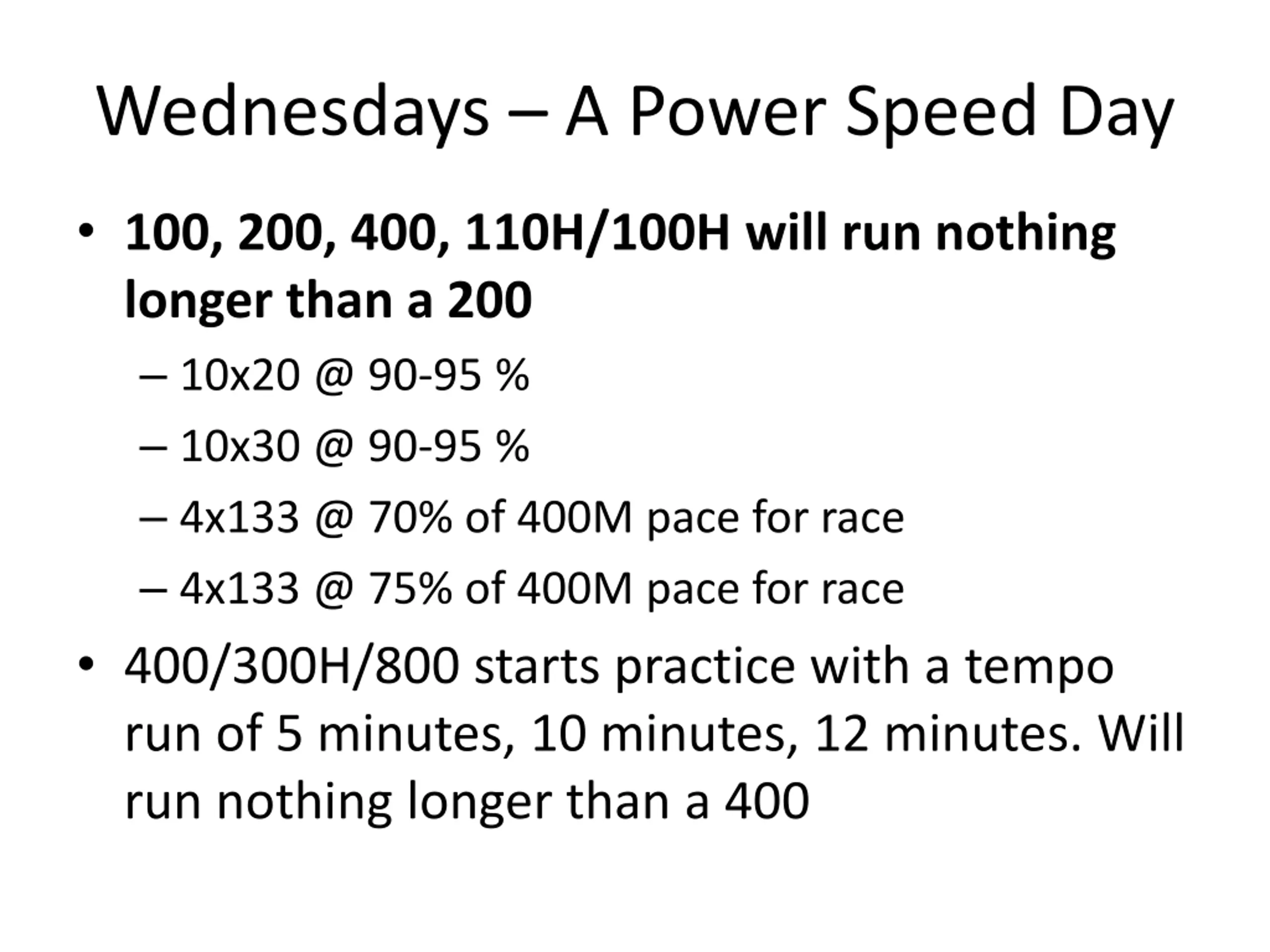 Wednesdays A Power Speed Day 100, 200, 400, 110H/100H will run nothing longer than a 200 10x20 @ 90-95 % 10x30 @ 90-95 % 4x133 @ 70% of 400M pace for race 4x133 @ 75% of 400M pace for race 400/300H/800 starts practice with a tempo run of 5 minutes, 10 minutes, 12 minutes. Will run nothing longer than a 400