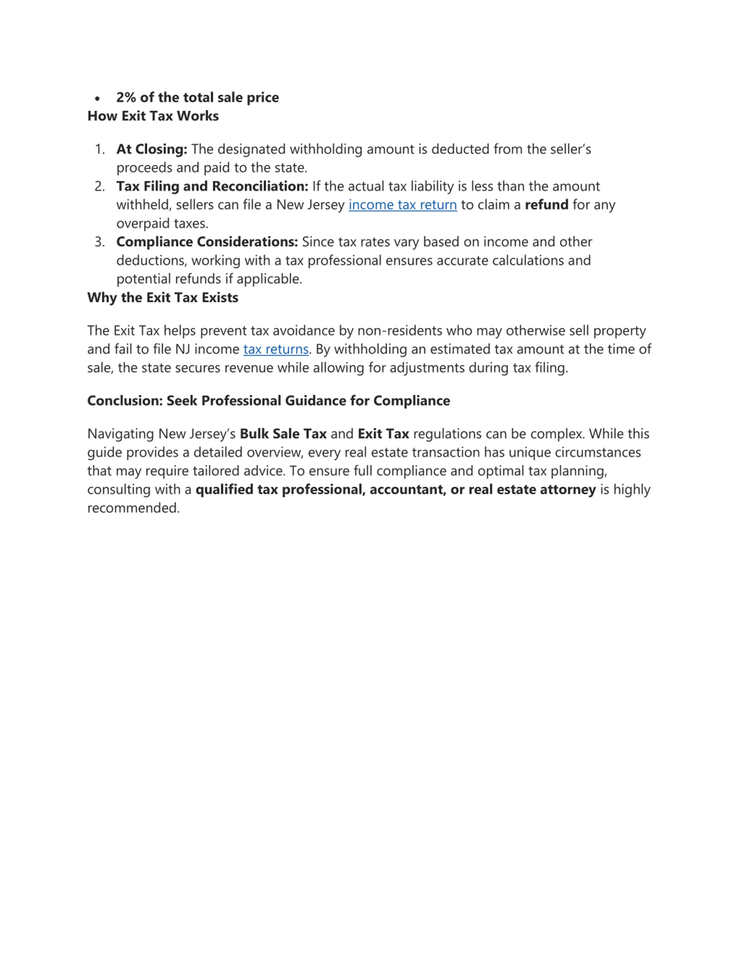 2% of the total sale price How Exit Tax Works 1.At Closing: The designated withholding amount is deducted from the seller s proceeds and paid to the state. 2.Tax Filing and Reconciliation: If the actual tax liability is less than the amount withheld, sellers can file a New Jersey income tax return to claim a refund for any overpaid taxes. 3.Compliance Considerations: Since tax rates vary based on income and other deductions, working with a tax professional ensures accurate calculations and potential refunds if applicable. Why the Exit Tax Exists The Exit Tax helps prevent tax avoidance by non-residents who may otherwise sell property and fail to file NJ income tax returns. By withholding an estimated tax amount at the time of sale, the state secures revenue while allowing for adjustments during tax filing. Conclusion: Seek Professional Guidance for Compliance Navigating New Jersey sBulk Sale Tax and Exit Tax regulations can be complex. While this guide provides a detailed overview, every real estate transaction has unique circumstances that may require tailored advice. To ensure full compliance and optimal tax planning, consulting with a qualified tax professional, accountant, or real estate attorney is highly recommended.