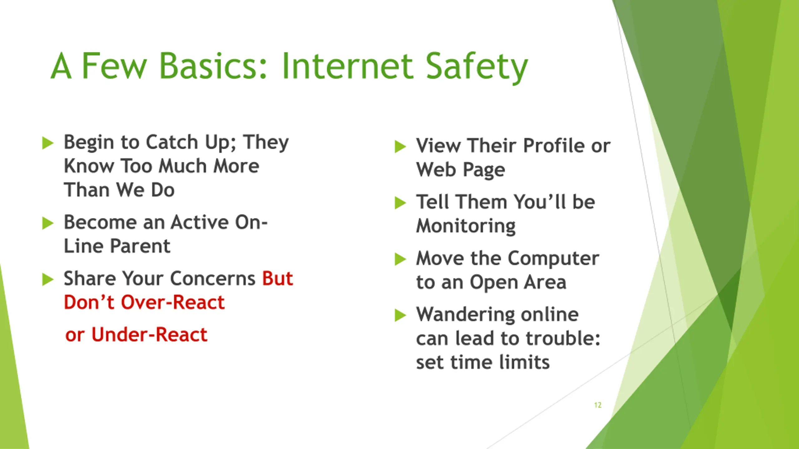 A Few Basics: Internet Safety Begin to Catch Up; They Know Too Much More Than We Do View Their Profile or Web Page Tell Them You ll be Monitoring Become an Active On- Line Parent Move the Computer to an Open Area Share Your Concerns But Don t Over-React or Under-React Wandering online can lead to trouble: set time limits 12