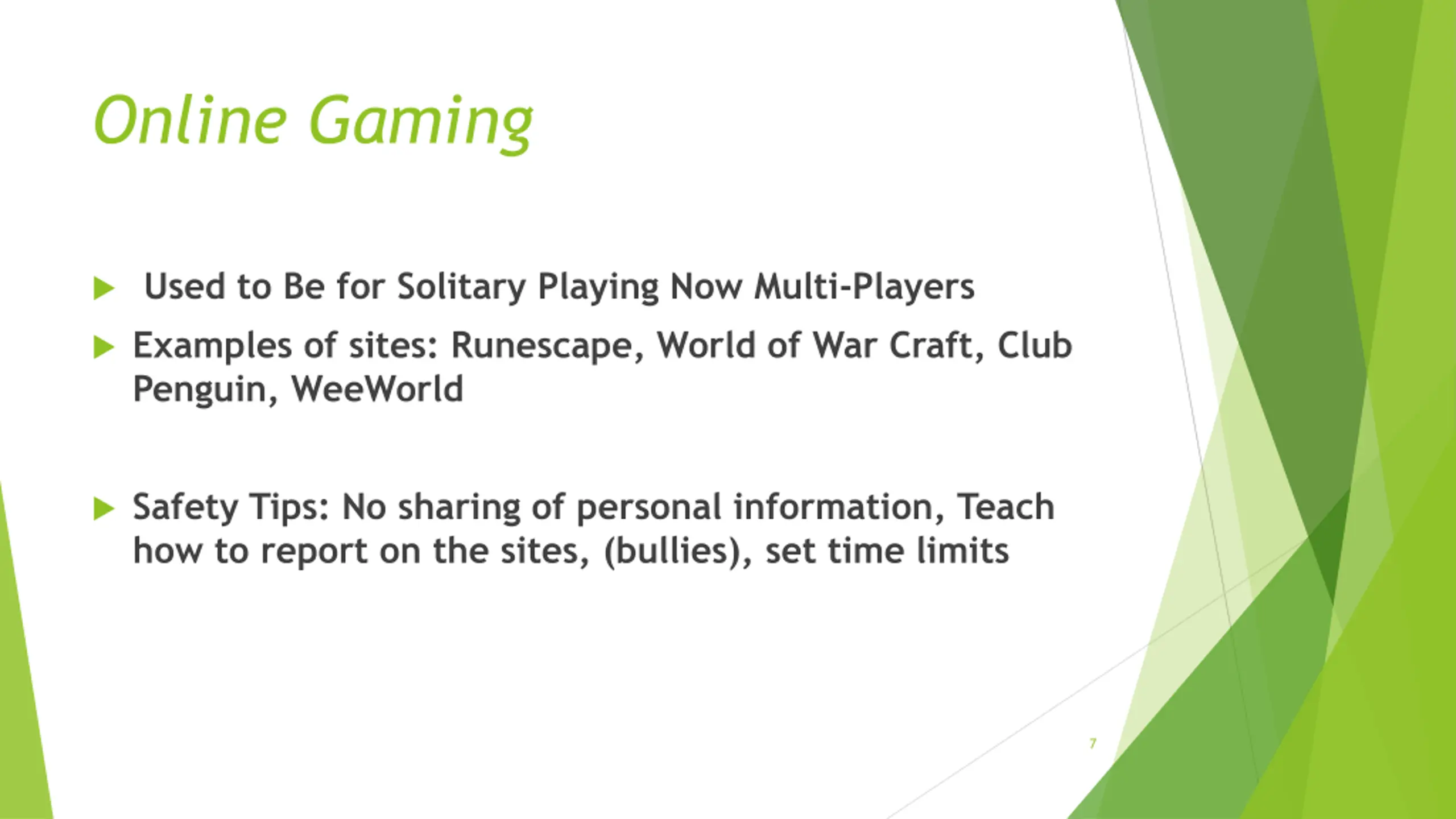 Online Gaming Used to Be for Solitary Playing Now Multi-Players Examples of sites: Runescape, World of War Craft, Club Penguin, WeeWorld Safety Tips: No sharing of personal information, Teach how to report on the sites, (bullies), set time limits 7