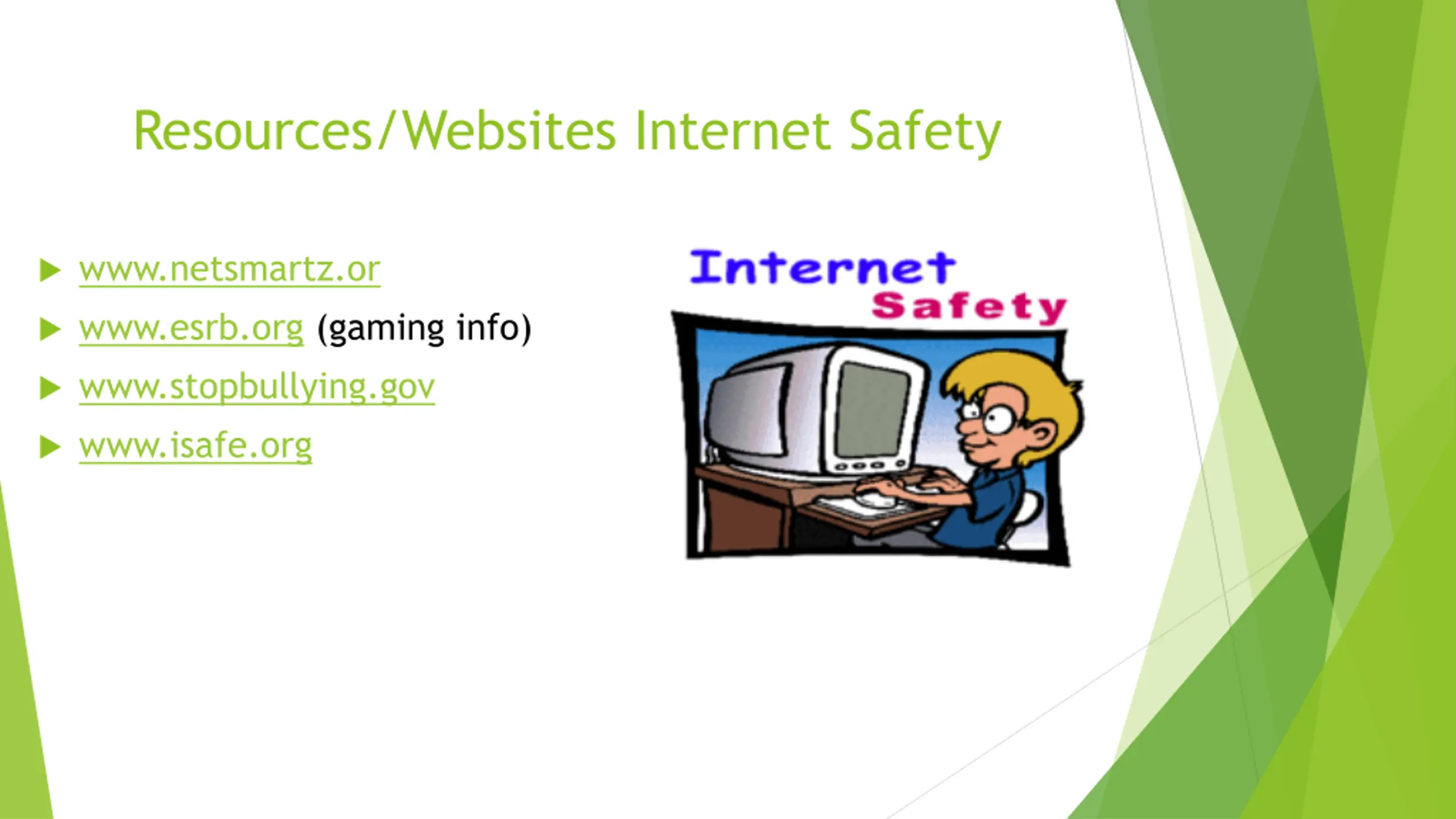 Resources/Websites Internet Safety www.netsmartz.or www.esrb.org (gaming info) www.stopbullying.gov www.isafe.org