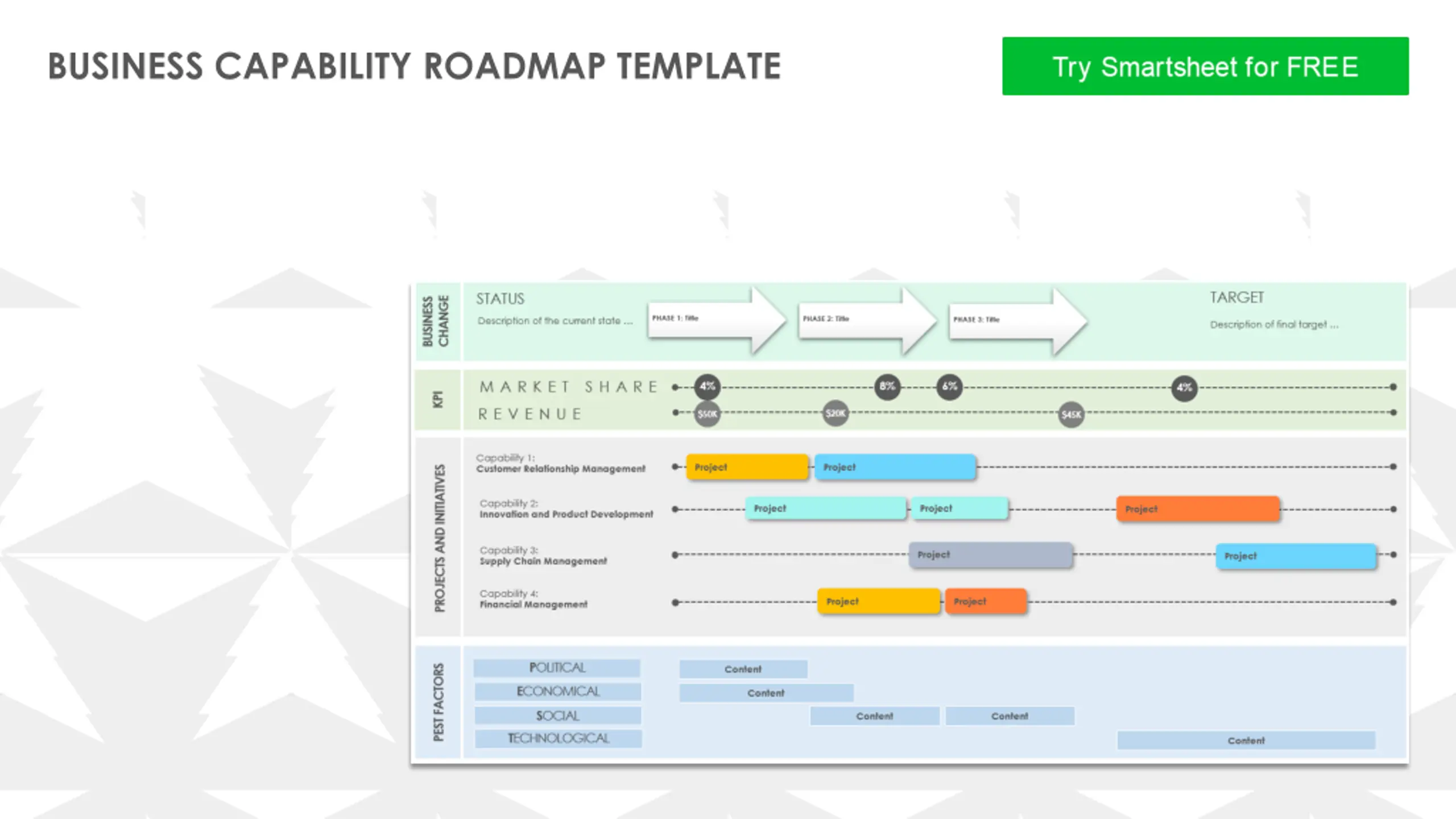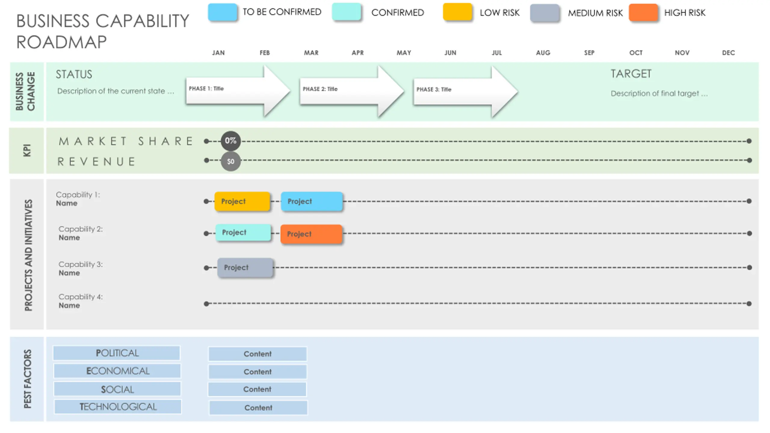 TO BE CONFIRMED CONFIRMED LOW RISK HIGH RISK MEDIUM RISK BUSINESS CAPABILITY ROADMAP JAN FEB MAR APR MAY JUN JUL AUG SEP OCT NOV DEC TARGET STATUS BUSINESS CHANGE PHASE 1: Title PHASE 2: Title PHASE 3: Title Description of the current state Description of final target M A R K E T S H A R E 0% KPI R E V E N U E $0 Capability 1: Name Project Project PROJECTS AND INITIATIVES Capability 2: Name Project Project Capability 3: Name Project Capability 4: Name POLITICAL PEST FACTORS Content ECONOMICAL Content SOCIAL Content TECHNOLOGICAL Content