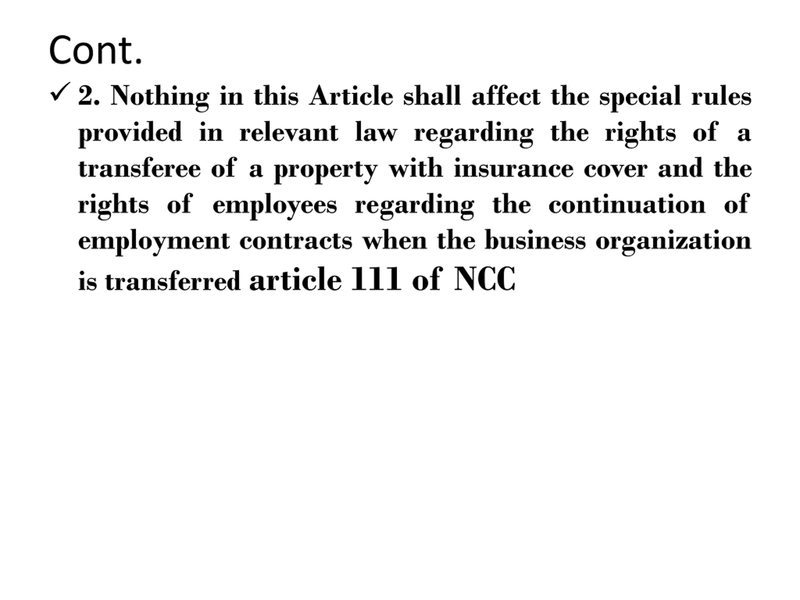 Cont. 2. Nothing in this Article shall affect the special rules provided in relevant law regarding the rights of a transferee of a property with insurance cover and the rights of employees regarding the continuation of employment contracts when the business organization is transferred article 111 of NCC